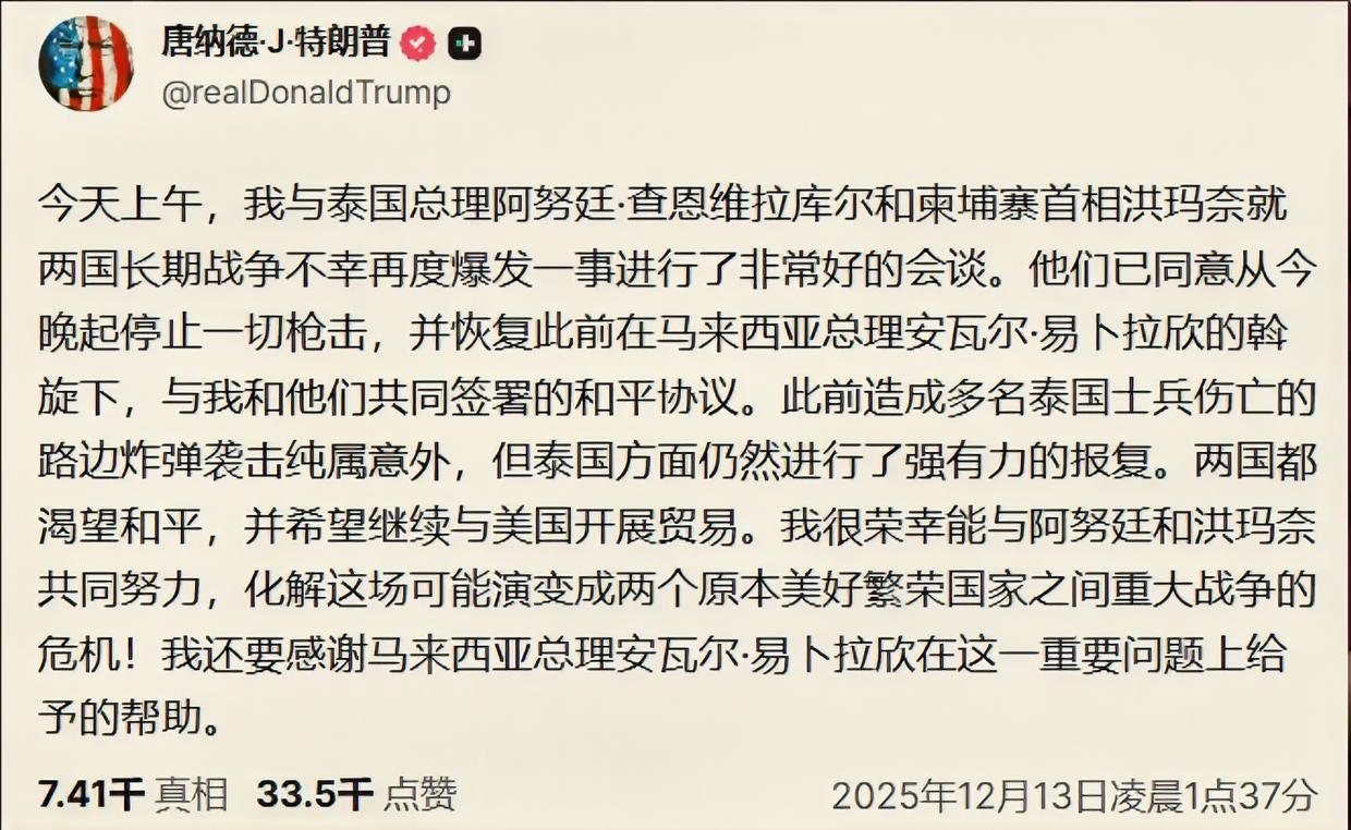 这几天国际媒体都在看笑话:特朗普刚宣布"搞定"泰柬停火,泰国就公开打脸说"没这回事",转头还派F-16炸了柬埔寨边境。 泰国阿努廷当天就表示:"我会解释立场,但不会简单让步",并强调任何和解必须由柬埔寨直接向泰国提出,而非通过美国转达。 泰国外长更狠,西哈萨公开表示对特朗普言论"感到非常失望",直言特朗普称泰国"反应过度"是对泰国人民感情的伤害。 柬埔寨虽然态度相对温和,但也只确认了通话,对停火只字不提,摆明了也是不给特朗普这个面子。 特朗普的"交易式外交"玩砸了。特朗普调停的逻辑很简单粗暴:"不停火就加征36%关税,签了协议就给你们降关税。" 泰国外长西哈萨直言不讳:"美国不应以关税相威胁迫使泰国进入谈判,7月的停火协议就是在美方压力下达成的,这种协议缺乏可持续性。" 特朗普的停火协议完全回避了泰柬之间的根本问题——柏威夏寺领土争端。连地雷清理、边境巡逻路线等具体问题都没谈拢,签了也是"废纸一张"。这种"头痛医头脚痛医脚"的做法,注定无法真正解决问题。 特朗普以为打个电话就能解决几十年的恩怨,这种傲慢让泰国人很不爽。阿努廷直接呛声:"他(特朗普)不可能比我更了解局势!" 这场冲突看似是泰国和柬埔寨不给特朗普面子,背后却是一场精彩的"小国如何在大国夹缝中求生存"的教科书案例。 泰国利用军事实力优势和国内民意支持,对特朗普说"不",既维护了主权尊严,又向中国释放了"独立自主"信号,同时还能通过强硬姿态巩固国内政治地位。 柬埔寨虽然在军事上处于劣势,但通过外交周旋和国际舆论,避免直接对抗美国,同时争取东盟等多边机制支持,为自己争取更多谈判筹码。 他们的共同底线就是,两国默契地不触碰中国利益,这是他们在中美之间保持平衡的"潜规则"。泰国炸桥时特意避开中资项目,柬埔寨也始终强调对华友好,这说明他们都清楚:在大国博弈中,完全倒向任何一方都是灾难。
