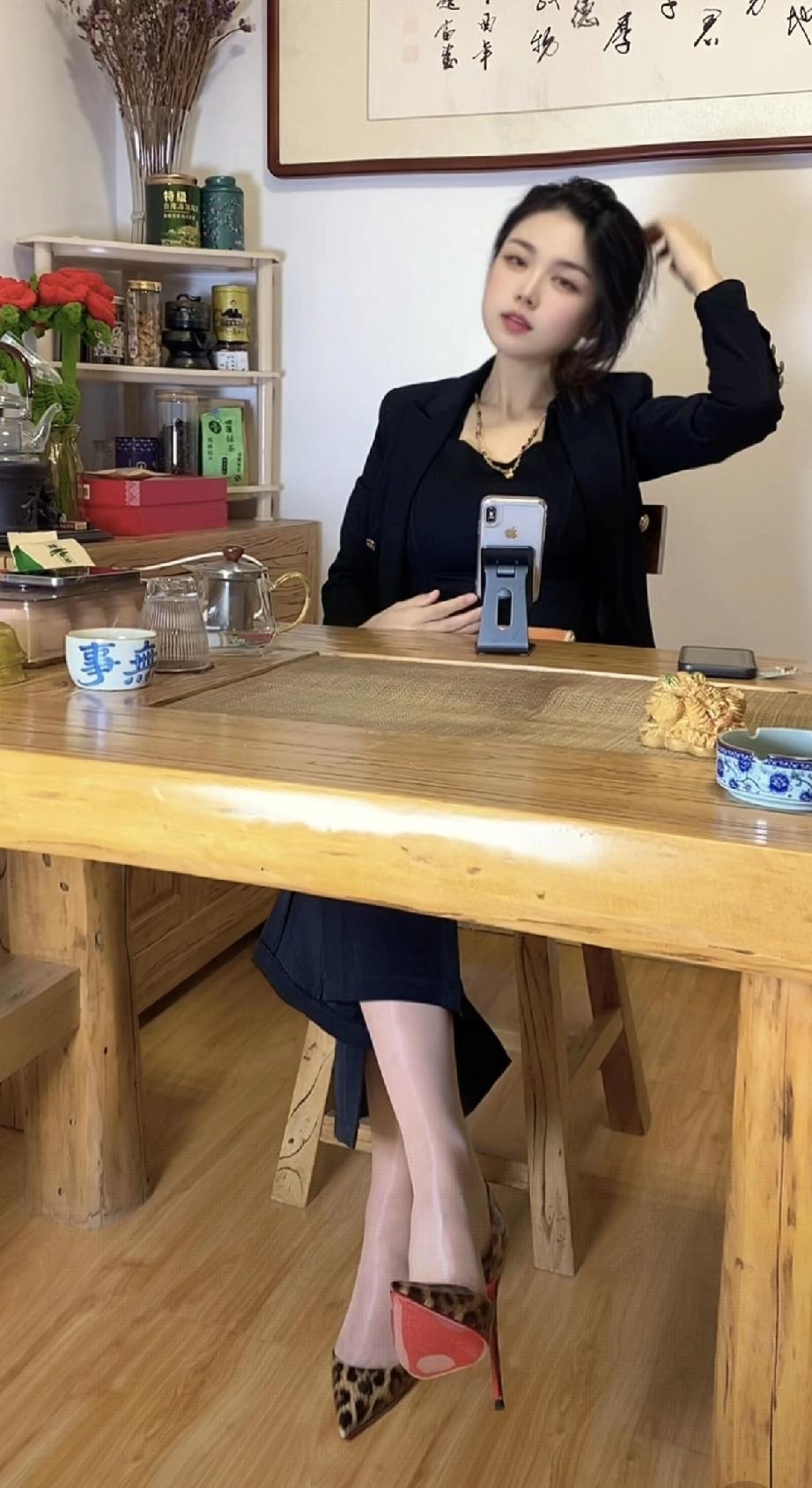 优雅职场女性,黑色套装搭配高跟鞋,尽显干练与魅力,现在退休了来直播可以吗?细高跟