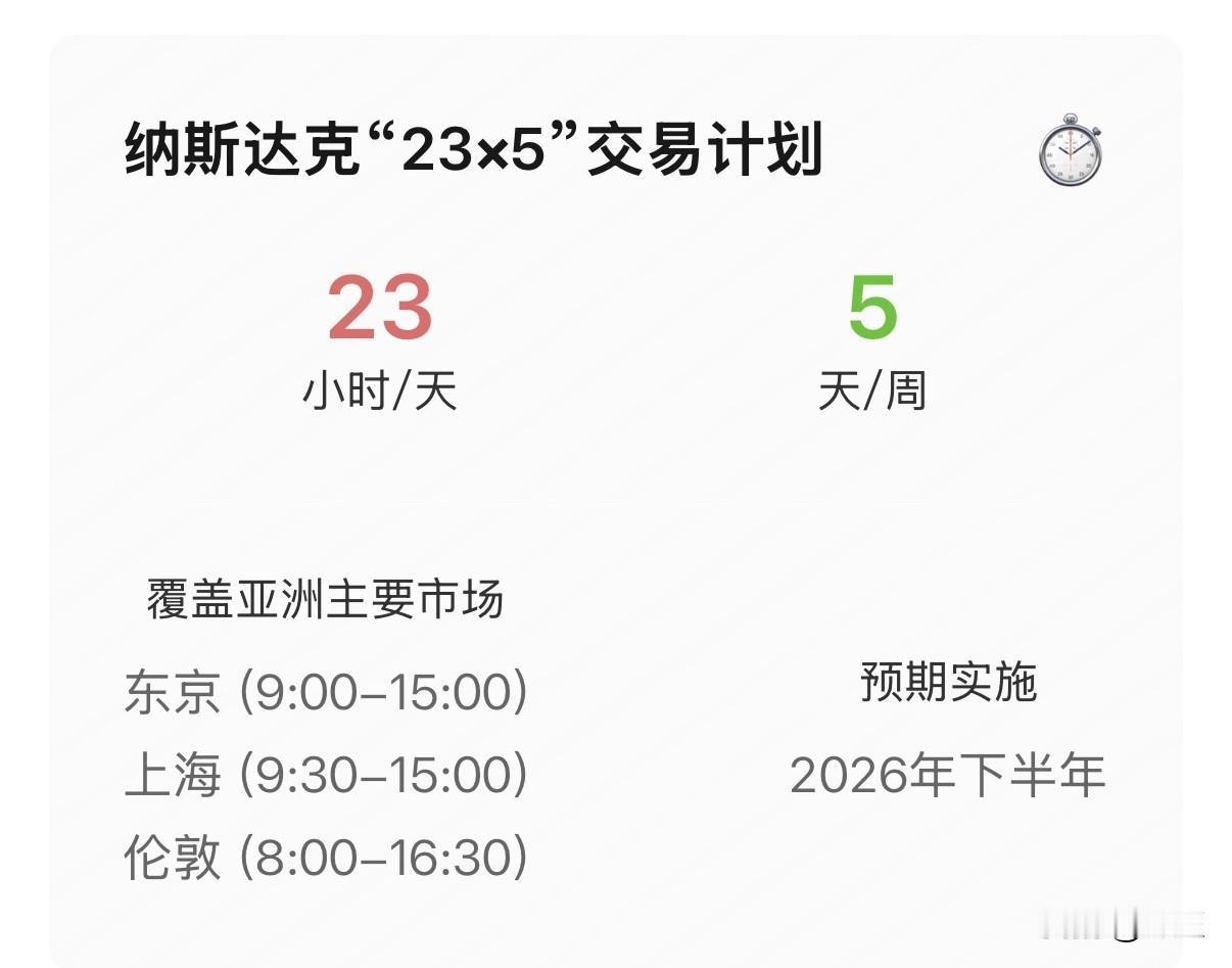 金融市场的"地球村"时代 当纳斯达克23小时交易与DTCC全天候清算在2026年Q4完成对接时,全球资本市场将呈现前所未有的景观: 东京9:00:日本散户开始交易苹果股票,成交量占当日美股总量的3% 伦敦14:00:欧洲对冲基金利用时差套利,在美股夜间时段完成跨大西洋套利 纽约21:00:美国本土投资者接力,形成真正的"日不落交易" 这种时空压缩效应将使全球资金定价权进一步向美股集中。据摩根大通测算,实施23小时交易后,美股在全球权益资产中的配置权重可能从当前的42%提升至55%,相当于每年新增1.2万亿美元的被动资金流入。 纳斯达克指数 纳斯达克 纳斯达克股市 纳斯达克市场