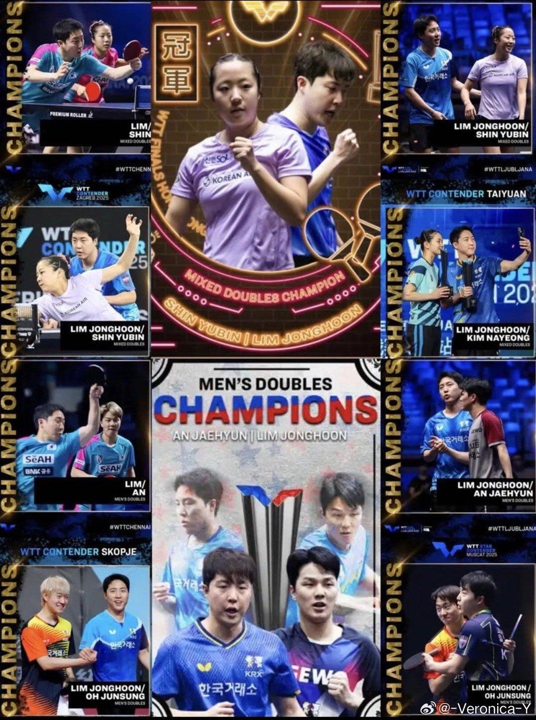 林钟勋:十次问鼎男双与混双冠军🏆🏆🏆🏆🏆🏆🏆🏆🏆🏆今年能一起拿下十个冠军,真的多亏了大家,谢谢大家☺️婚礼一结束就直接比赛,蜜月旅行都没能去就马上投入训练、参加总决赛,谢谢你们帮助并理解我,让我能够心无旁骛地训练和比赛。多亏了大家,今年才凑满了十个冠军,真的非常感谢。还有yer._.im_u (老婆)我爱你❤️哈哈哈林钟勋今年在wtt男双和混双项目共获得10个冠军是所有运动员里最多的3月金奈球星男双/混双(with安宰贤/申裕斌)4月太原挑战混双(with金娜英)6月斯科普里挑战男双(with吴晙诚)卢布尔雅那球星男双/混双(with安宰贤/申裕斌)萨格勒布挑战混双(with申裕斌)7月美国大满贯男双(with安宰贤)11月马斯喀特球星男双(with吴晙诚)12月香港年终赛混双(with申裕斌)