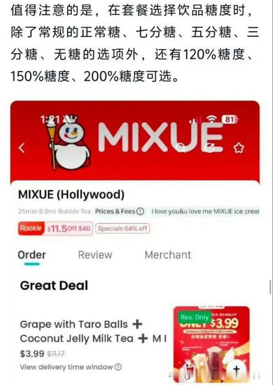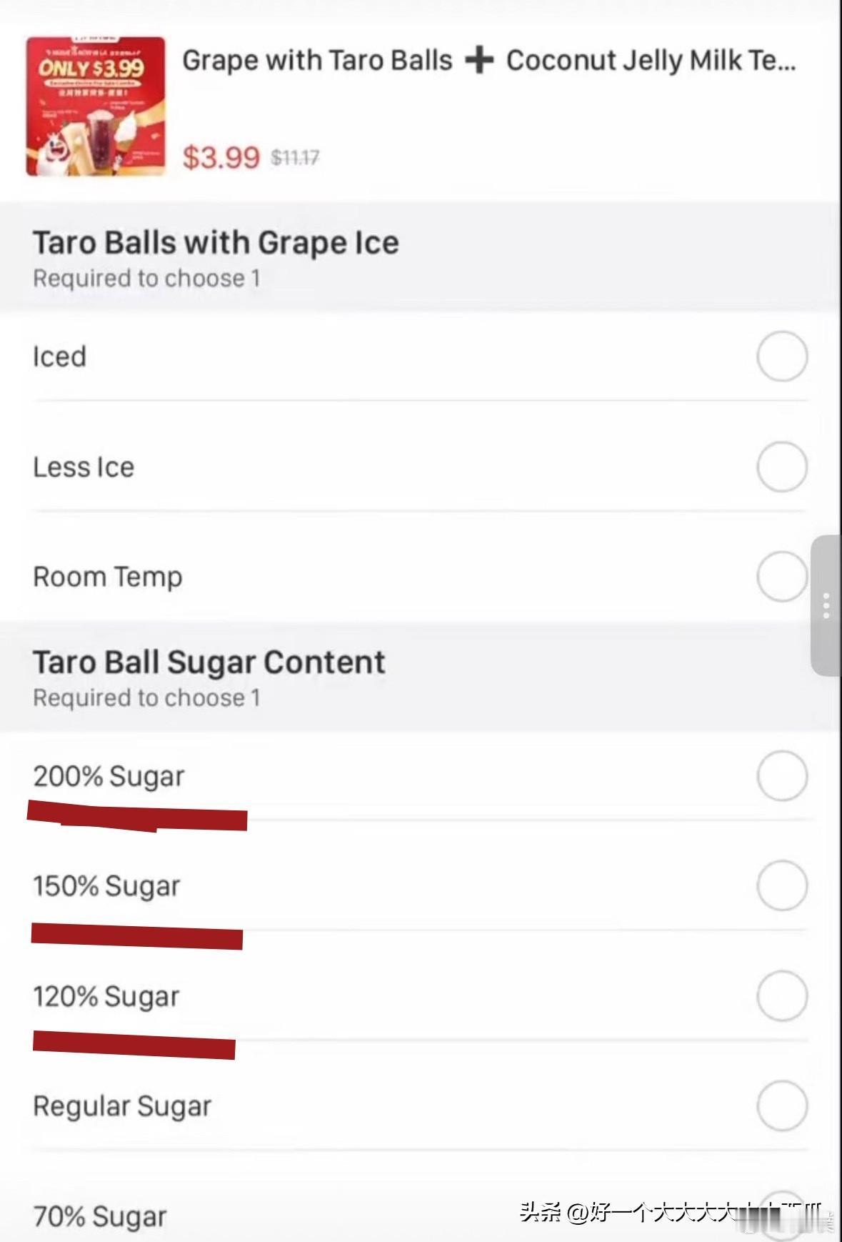到底美国人有多喜欢吃糖, 从国民品牌蜜雪冰城在美国地区的店内点餐单就看得出来, 我们国内最多也就点个全糖, 可是美国的蜜雪冰城居然有120%糖、150%糖和200%糖的选择。 难怪美国的超级大胖子那么多呢, 天天不是芝士就是糖的。
