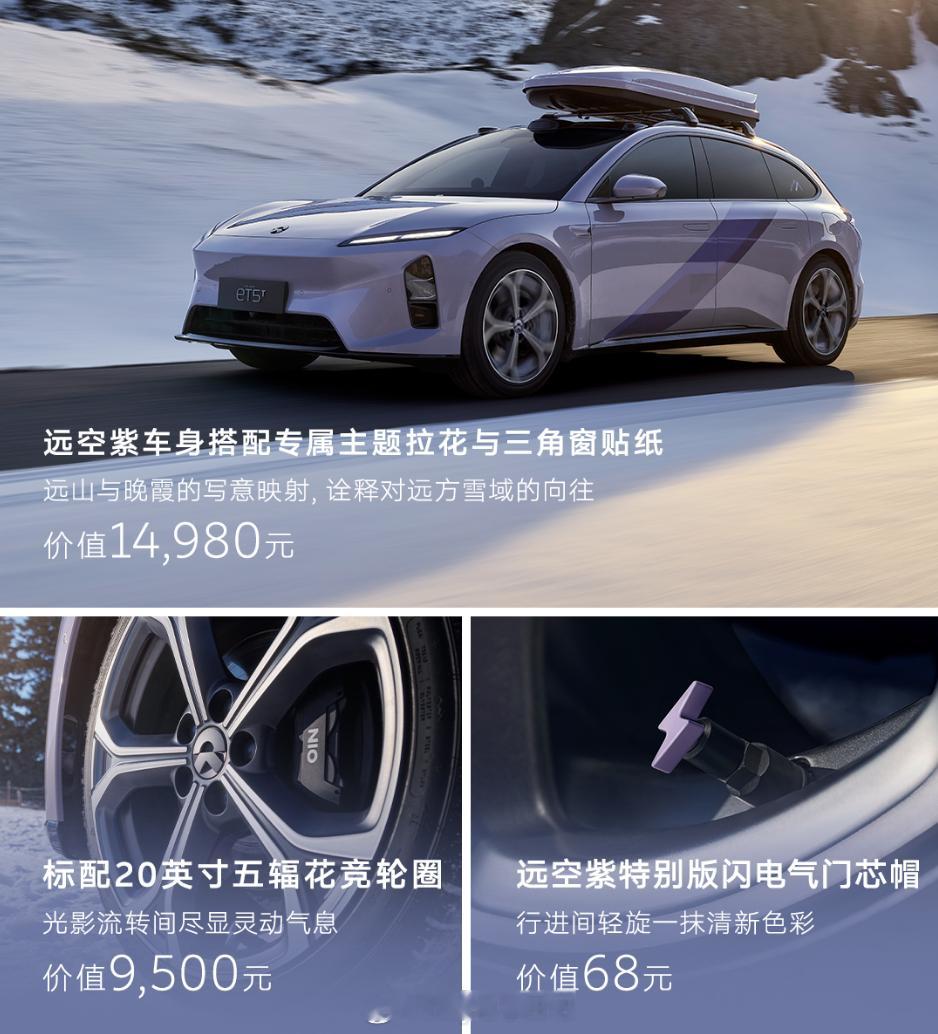 作为ET5T老车主,真心羡慕了!!!!太好看了吧!!!蔚来的颜值永远都在线!这次的远空套装紫色太优雅了!车顶行李箱居然也标配了!还是车身同色!!细节狂魔还有更细节的地方,气门芯是紫色的闪电造型,这到底是谁想出来的?太绝了!看完我也想把我的小黄拿去改一改了,羡慕极了!大v聊车