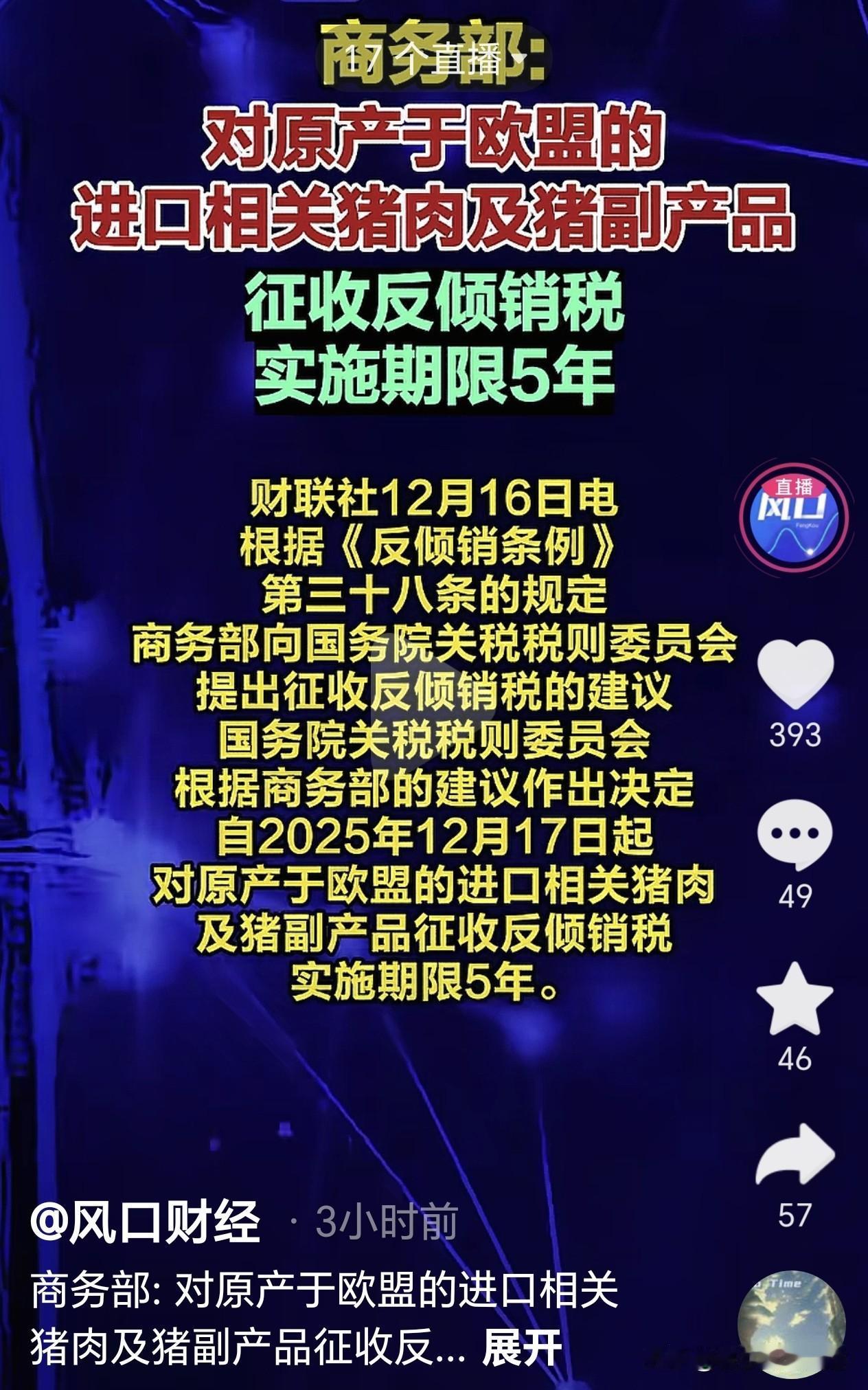 好消息!商务部对欧盟猪肉动手了,猪价不能再跌了! 财联社12月16日电,商务部依据《反倾销条例》第三十八条,向国务院关税税则委员会提出建议,国务院关税税则委员会决定:自2025年12月17日起,对原产于欧盟的进口猪肉及猪副产品征收反倾销税,实施期限5年。 真是大好消息啊!最近猪肉价格跌得都快“白菜价”了,养猪的老百姓愁得慌——辛辛苦苦养一头猪,卖不上价,成本都收不回来,再这样下去,一年白干!为啥猪价跌这么狠?就是欧盟那边的猪肉低价倾销,大量进口冲击了国内市场,咱们本土养殖户压力山大。 这次商务部果断出手,征收反倾销税,就是给欧盟猪肉设个“门槛”,阻止它们低价砸过来。这样一来,国内猪肉价格能稳一稳,养猪的老乡们也能少亏点,算是帮咱们老百姓守住了“钱袋子”。以后欧盟想随便进口猪肉?没那么容易了,咱们自己的养猪产业,得优先保护起来!