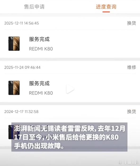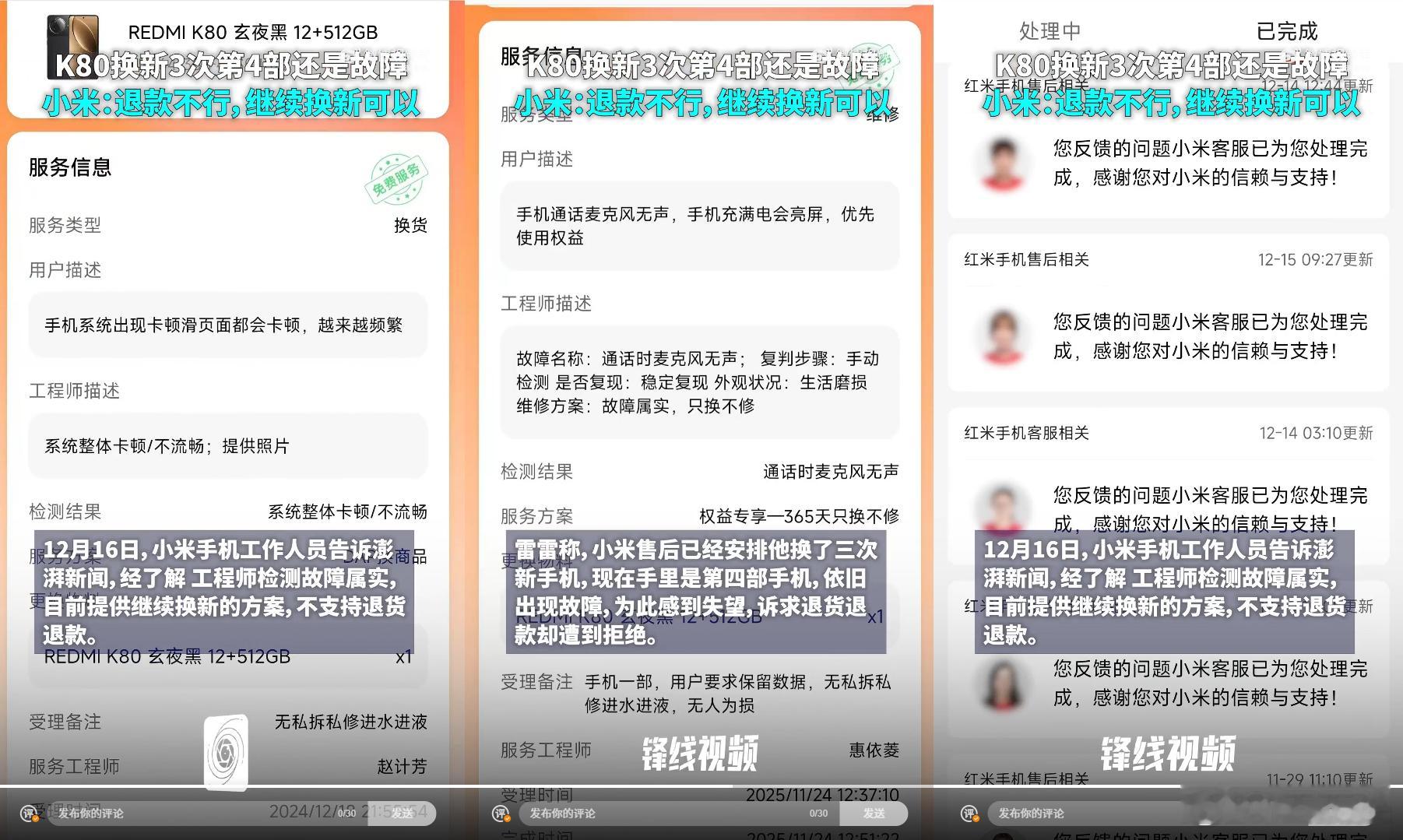 K80手机换新3次第4部还是故障 2024年12月4日,以2899元购买了一台K80;然后在当年12月18日进行首次换货,换货原因是系统整体卡顿/不流畅;2025年11月24日进行第二次换货,原因是通话时麦克风无声;12月11日又进行了第三次换货,用户称手机有问题,但没有公布故障原因,工程师后表示故障属实,提供继续换新方案。但用户要求退货退款,小米工作人员则表示不支持退款。我觉得如果是真有问题就应该好好解决,但前提是检测清楚,像麦克风无声这种会不会存在不合理使用导致损坏?那么不合理损坏是否满足三包?毕竟一部新手机在正常使用下连续出现多种不同故障属于极低概率事件,可能比中彩票概率还低。