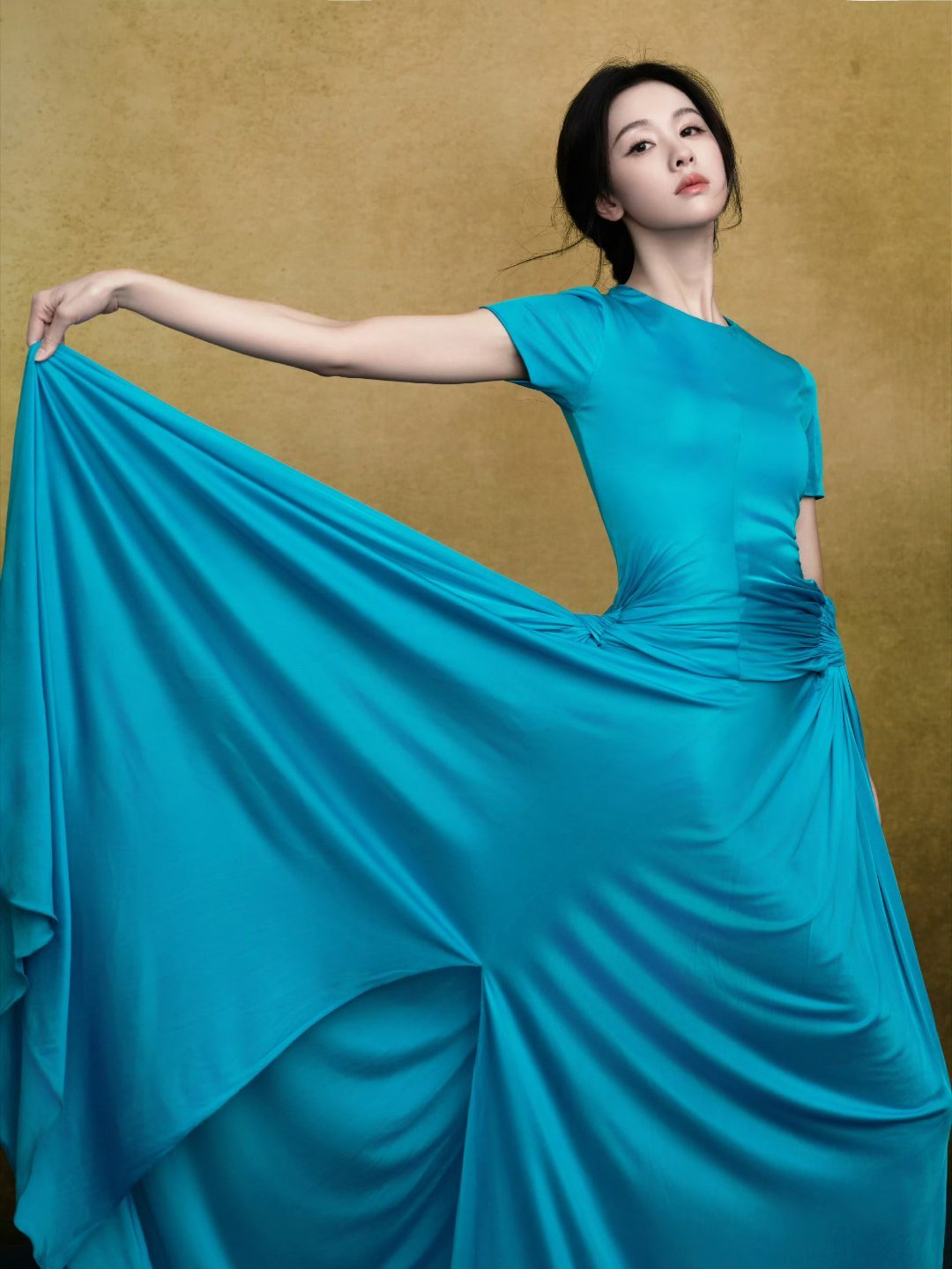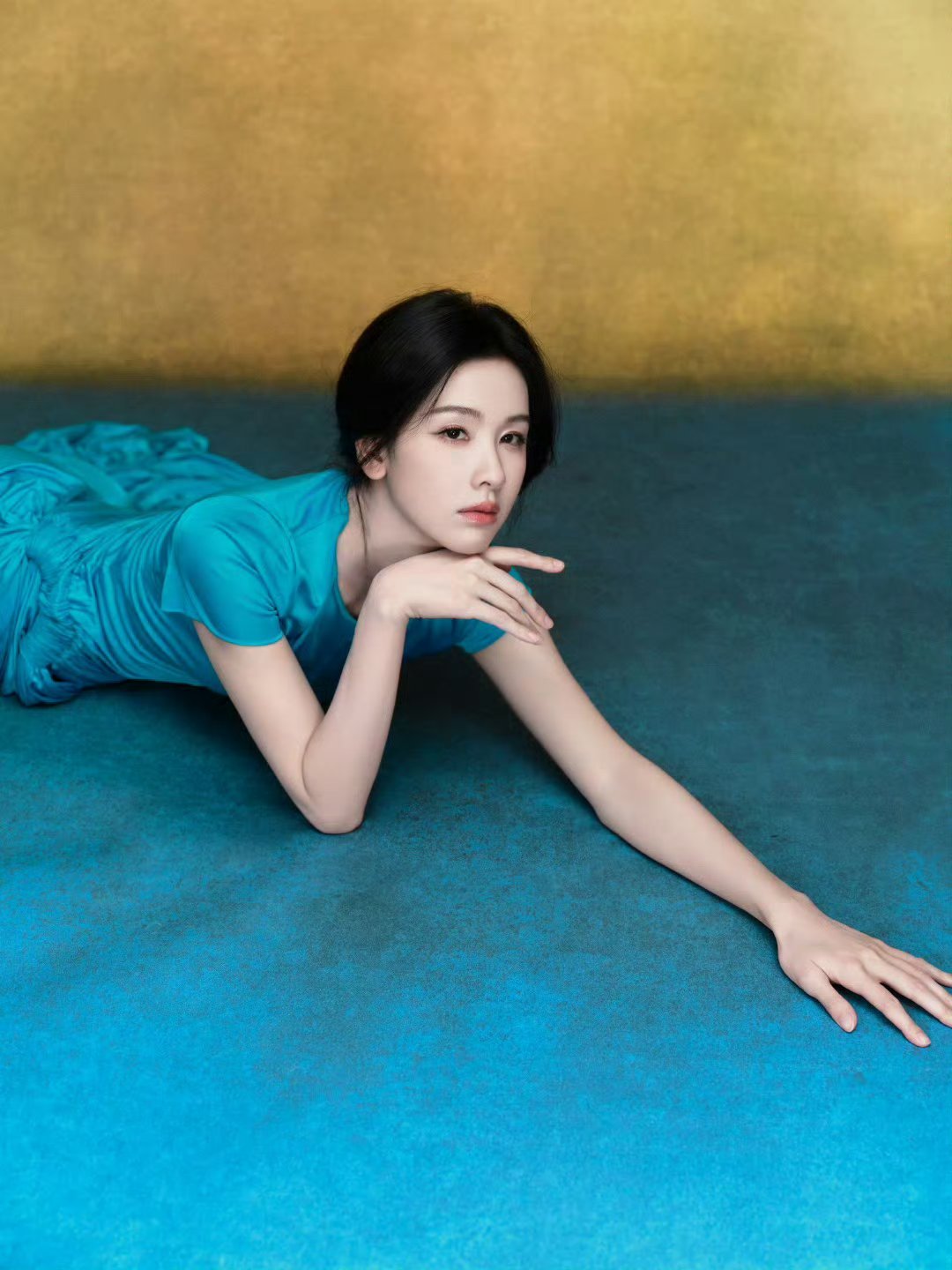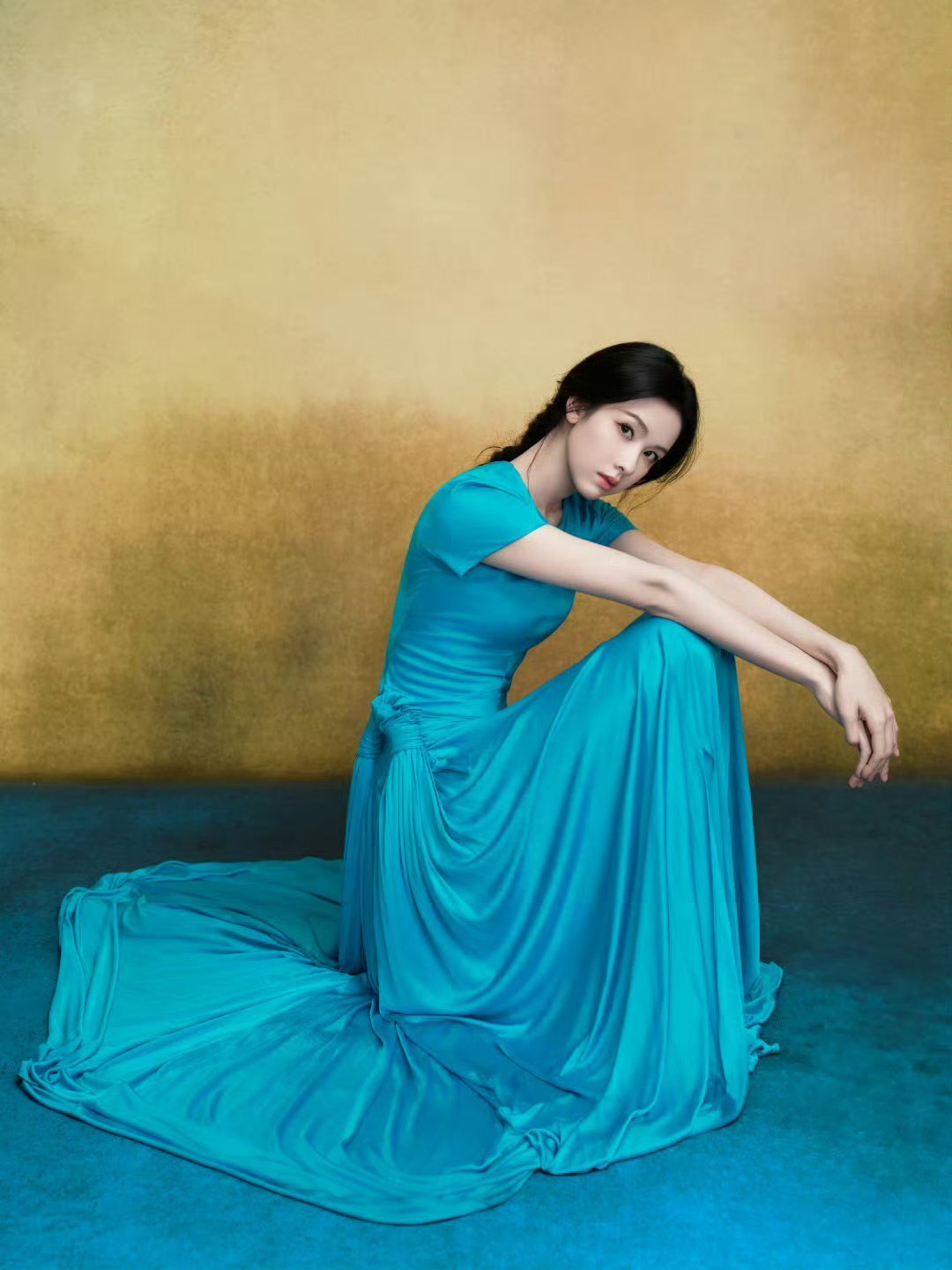 这身幽蓝长裙格外衬她的肤色,低头整理手包时,颈后露出的一小片皮肤白得透光。路过花店时,老板娘忍不住夸“裙子颜色真特别”,她轻轻点头道谢,耳尖泛起的红比花店里的玫瑰还要淡一些。陈都灵幽蓝长裙