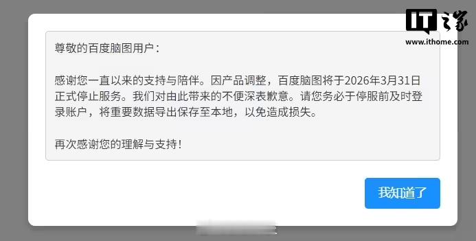 【百度脑图宣布将停止服务】百度脑图日前发布公告,因产品调整,百度脑图将于 2026 年 3 月 31 日正式停止服务。“我们对由此带来的不便深表歉意。请您务必于停服前及时登录账户,将重要数据导出保存至本地,以免造成损失。”百度脑图是一款脑图编辑工具,用户可以在线上直接创建、保存并分享思路。百度脑图官方问答页面称,脑图不会忽然彻底挂掉让大家的数据都丢失的,真要挂也会提前半年让大家迁移数据。