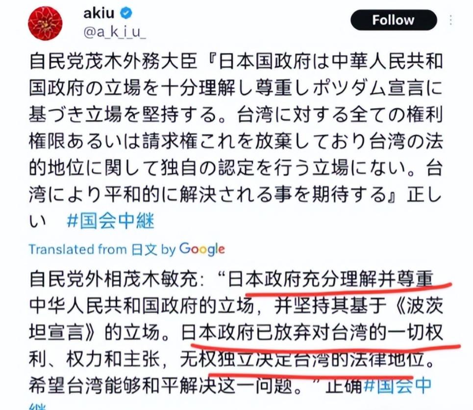日本低头了! 12月15日,日本外务大臣茂木表示:日本政府充分理解并尊重中华人民共和国政府的立场,坚持基于《波茨坦公告》的相关主张。日本已放弃对台湾的一切权利、权限及诉求,并未就台湾的法律地位持有独自认定的立场。日方期待台湾问题能够由相关方和平解决。 往前倒十天,首相高市早苗还在国会里硬撑,攥着 1951 年《旧金山和约》当 “挡箭牌”,嘴硬说 “日本只是放弃台湾,归谁不好说”。话音刚落,中国外交部的回应就来了,毛宁的话掷地有声:“这和约没中国参加,就是张废纸,台湾是中国的,轮不到日本置喙。” 高市早苗敢玩火,不是脑子热。她身后站着两拨人:一拨是日本右翼,这群人总惦记着当年殖民台湾的旧梦,亲台议联在国会里呼风唤雨,她得靠这些票仓稳位置;另一拨是美国,日美联合声明里刚写了 “台海有事就是日本有事”,她想借美国的势,在台湾问题上捞点政治资本。 可她忘了,中国不吃这一套。高市话音刚落,中方的反制就精准落地。那个窜访台湾、给台军当 “军事顾问” 的前自卫队高官岩崎茂,资产直接被冻,中国边境对他永远关上大门。 这记 “敲山震虎” 让东京慌了 — 岩崎不是普通人,他手里攥着日台军事联动的底牌,从导弹部署到情报共享,全是见不得光的勾连。 更让日本疼的是钱袋子。高市一放话,中国游客赴日预订量直接砍半。日本旅游业协会急得跳脚,算过一笔账:要是中国游客再不来,明年日本少赚 1.2 万亿日元,相当于 600 亿人民币,多少温泉旅馆、免税店得关门。老百姓的怒火顺着网线烧到国会,旅游业者拉着横幅抗议。 这下,高市早苗的 “硬骨头” 也软了。她只能把茂木敏充推到台前,演一出 “缓和戏”。可这戏演得漏洞百出 — 茂木说认《波茨坦公告》,却绝口不提 “台湾是中国一部分”;说放弃权利,转头日台民间交流协会就接着搞 “人才计划”,换着法子勾连。 这猫腻,明眼人都看得穿。日本就是想 “两头讨好”:对中国说 “我们守规矩”,对美国说 “没松劲”,对台湾说 “还能帮衬”。可台湾问题是中国的红线,哪容得下这般算计。 这些年,日本的小动作从没停过。从偷偷给台军送 “军事教材”,到帮着美国在台海搞联合军演;从政客窜访台湾喊 “加油”,到把 “台湾有事” 写进防卫大纲。表面上喊着 “和平解决”,背地里却在给 “台独” 递刀子。 但现在,局势变了。中国的反制不是 “雷声大”,而是 “雨点狠”。除了冻资产、拒入境,海关总署对日本部分农产品的检验标准再提一级,原本三天通关的货物,现在得细查一周。日本农协急得天天往首相官邸跑,他们比谁都清楚,中国市场丢不得。 茂木的表态,说到底是现实逼的。日本既想靠中国市场赚钱,又想跟着美国搞事,这种 “又当又立” 的日子,早该到头了。台湾问题从来不是日本的 “筹码”,更不是美国的 “棋盘”,而是中国的内政,是 14 亿人的底线。 高市早苗的算盘碎了,可日本的试探未必会停。说不定哪天,又会有政客跳出来说些模棱两可的话,又会有 “退休官员” 去台湾搞小动作。 台海的风,从来由不得外部势力吹。日本要是还抱着 “模糊台湾地位” 的幻想,还想把台湾当 “棋子”,迟早会尝到苦果。