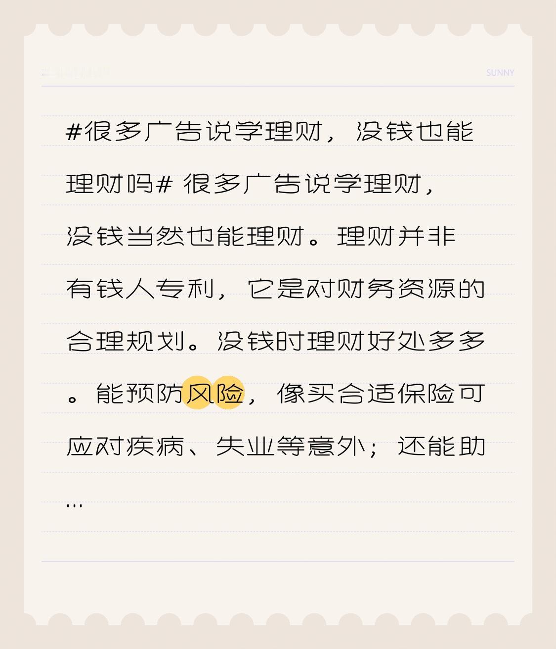 很多广告说学理财,没钱当然也能理财。理财并非有钱人专利,它是对财务资源的合理规划。 没钱时理财好处多多。能预防风险,像买合适保险可应对疾病、失业等意外;还能助力实现财务目标,比如存钱买房。 不过理财广告骗局不少,“1元学理财”的网课可能就是陷阱。而且过去几年理财市场问题频出,银行理财不保本,信托、私募暴雷。理财亏损与暴雷,90%集中在有认知误区的人群。比如认为收益率不高就安全、有背景平台就不会出事、把理财当存款替代品。没钱理财可以先储蓄,再学基础理财知识,货币基金就很适合入门。