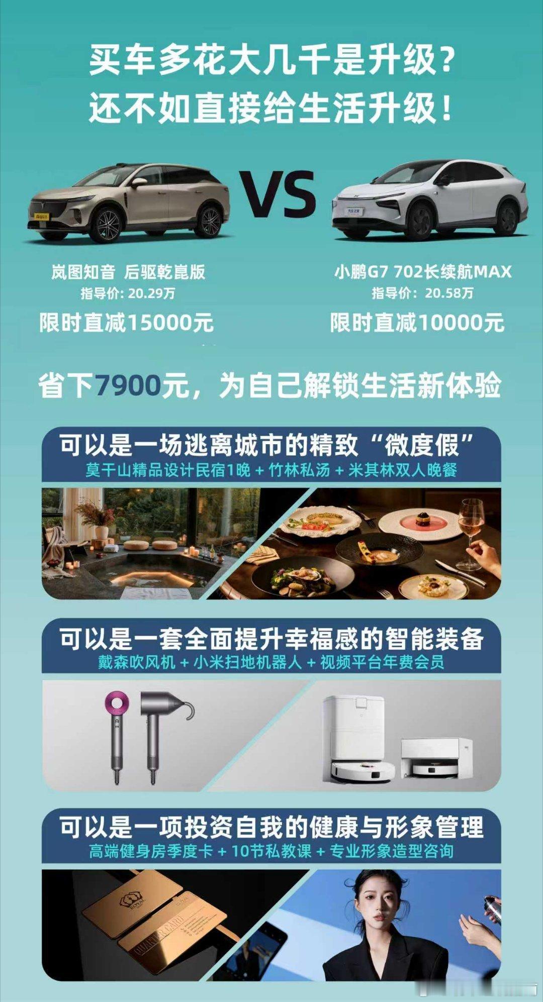 现在买车还能拿米其林双人晚餐?不是标题党!同样是20万级纯电SUV,岚图知音后驱乾版(指导价20.29万)限时直减1.5万,而小鹏G7702长续航MAX(指导价20.58万)限时直减1万——不算不知道,一对比选岚图知音,直接省下实打实的7900元。这7900元,如果换个思路,既能坐拥岚图知音满配的实用配置,又能把省下来的钱砸进生活,直接解锁「用车+生活」双重顶配体验,才是真・明智之选。全新岚图知音 小鹏G7年末买车