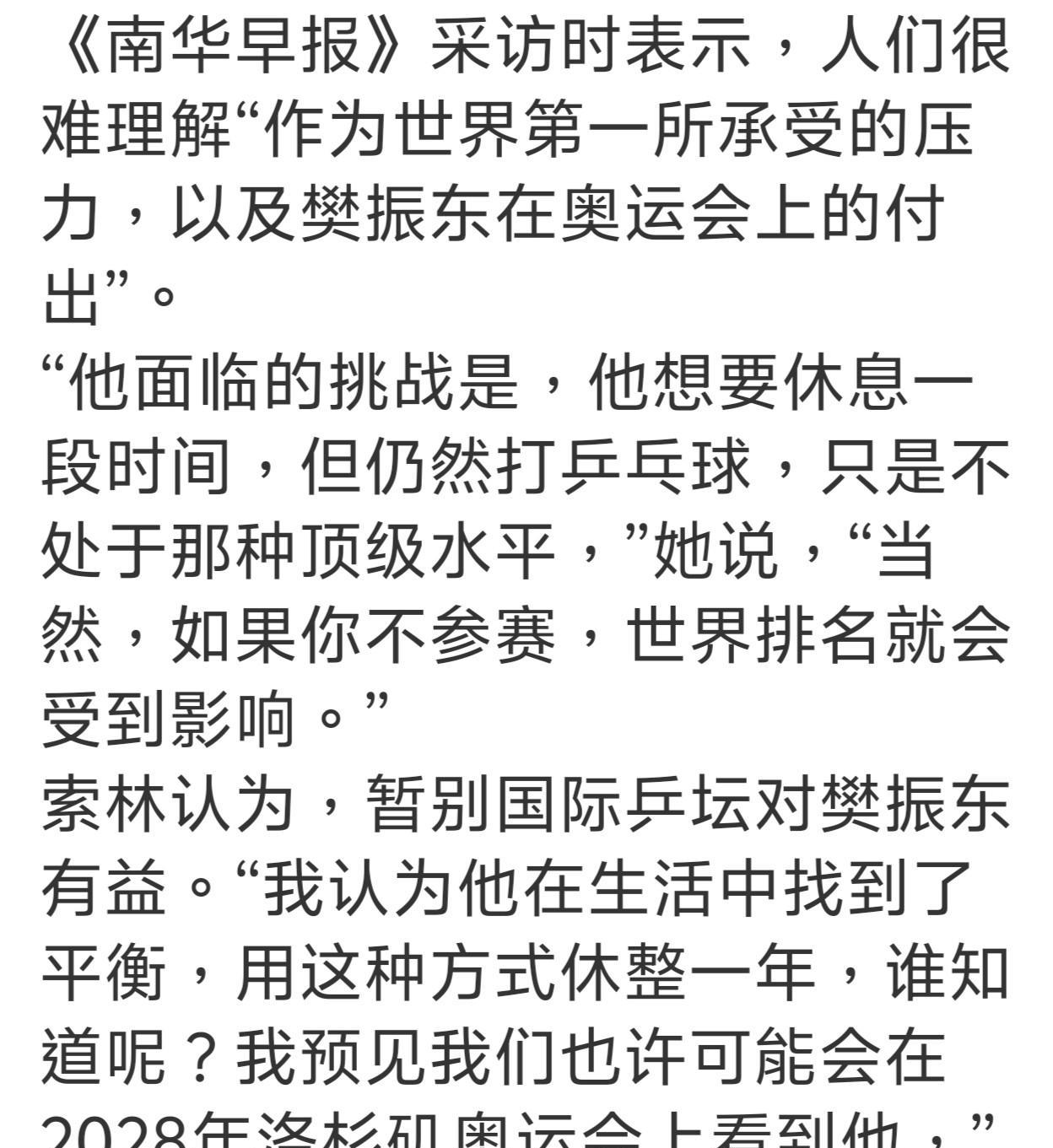 预测樊振东2026年回归国际赛场: 最早是2026年2月参加中国海口亚洲杯(通过东道主提名,不占名额)。 最迟是2026年3月底参加澳门世界杯。 参加亚洲杯单打进入4强后就能够获得世界杯参赛资格了。 目前男队的压力可不只是日本队而已,而欧洲多国对中国队构成的威胁程度己经是不言而喻了。说真的,如果樊振东不回来,以男队现在的实力,真的很难保证伦敦世乒团体赛中国队能否实现卫冕。 明年除了亚洲杯,世界杯,世乒团体赛,亚锦赛外,2026年10月还有四年一届的亚运会在日本名古屋举行! 不过,估计国乒在2026年1月中下旬还有一个冬训,希望到时能看到小胖归队。