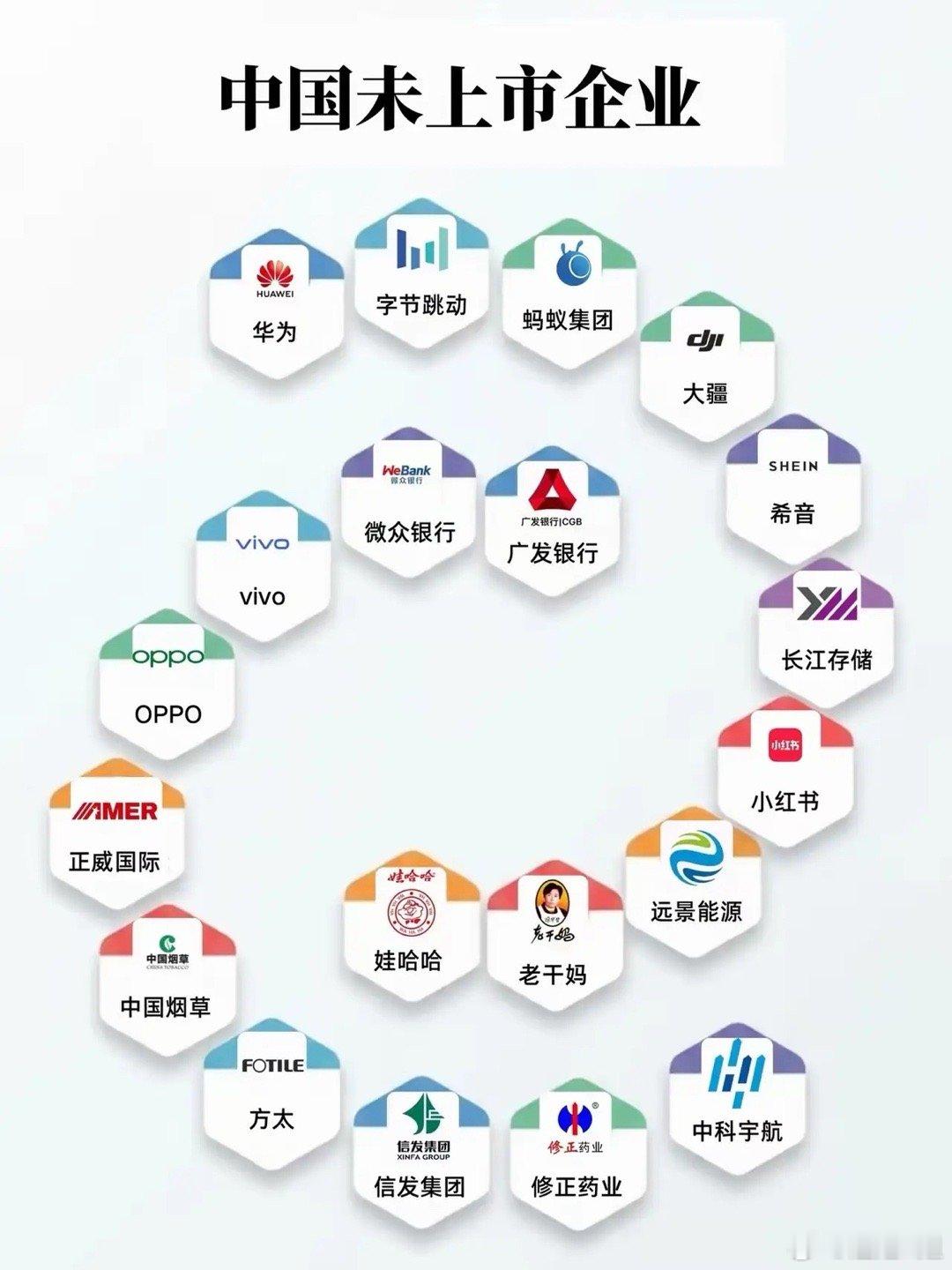 藏不住了!中国这18家未上市巨头太能打,覆盖科技金融半壁江山别只盯着股市里的公司了!中国还有一批没上市却手握"王炸"的狠角色,横跨科技、金融、消费等关键领域,每一家都在各自赛道封神——🔥 科技圈"隐形王者":技术硬到没朋友• 华为:刚发麒麟9020芯片和三屏折叠机,卫星通信、鸿蒙系统持续领跑,不上市也稳坐全球科技顶流。• 字节跳动:抖音、TikTok全球吸金,但高管多次辟谣上市计划,专心打磨飞书等新业务。• 大疆:占据全球消费级无人机70%以上市场,从农业到影视全场景通吃。• 长江存储:打破国外存储芯片垄断,国产内存的"希望之光"。• 中科宇航:民营航天领军者,火箭回收技术不断突破,太空赛道的潜力股。💰 金融界"低调玩家":实力藏在数据里• 蚂蚁集团:整改进入收尾阶段,2026年有望冲击上市,旗下支付宝、钱塘征信已站稳脚跟。• 微众银行:国内首家互联网银行,凭借微粒贷服务千万用户,科技风控能力拉满。• 广发银行:背靠强大股东,信用卡、对公业务稳居行业前列,低调布局综合金融。🛍️ 消费&制造"顶流担当":口碑销量双丰收• 希音(SHEIN):从伦敦转战香港冲刺上市,虽估值从千亿跌至300亿,但快时尚供应链仍具全球竞争力。• vivo/OPPO:全球手机市场常年稳居前五,影像技术和线下渠道无人能及。• 小红书:年轻人的"消费决策入口",种草经济鼻祖,商业化潜力持续释放。• 方太:高端厨电代名词,油烟机、洗碗机凭口碑碾压外资品牌。• 修正药业:国民药企,从感冒药到保健品,承包几代人的家庭药箱。⚙️ 硬核制造&能源"幕后大佬"• 正威国际:全球有色金属巨头,产业链从矿产延伸到电子元件,实力深不可测。• 信发集团:铝业龙头企业,产能和技术指标领跑行业,隐形的制造业巨鳄。• 远景能源:风电、储能技术全球领先,碳中和赛道的关键玩家。• 中国烟草:不用多说的"营收巨兽",常年稳坐全球最赚钱企业梯队。这些企业要么靠技术壁垒躺赢,要么凭规模垄断市场,没上市却比很多上市公司更有话语权。哪一家是你心中的"最可惜未上市企业"?(仅供交流,非投资建议)