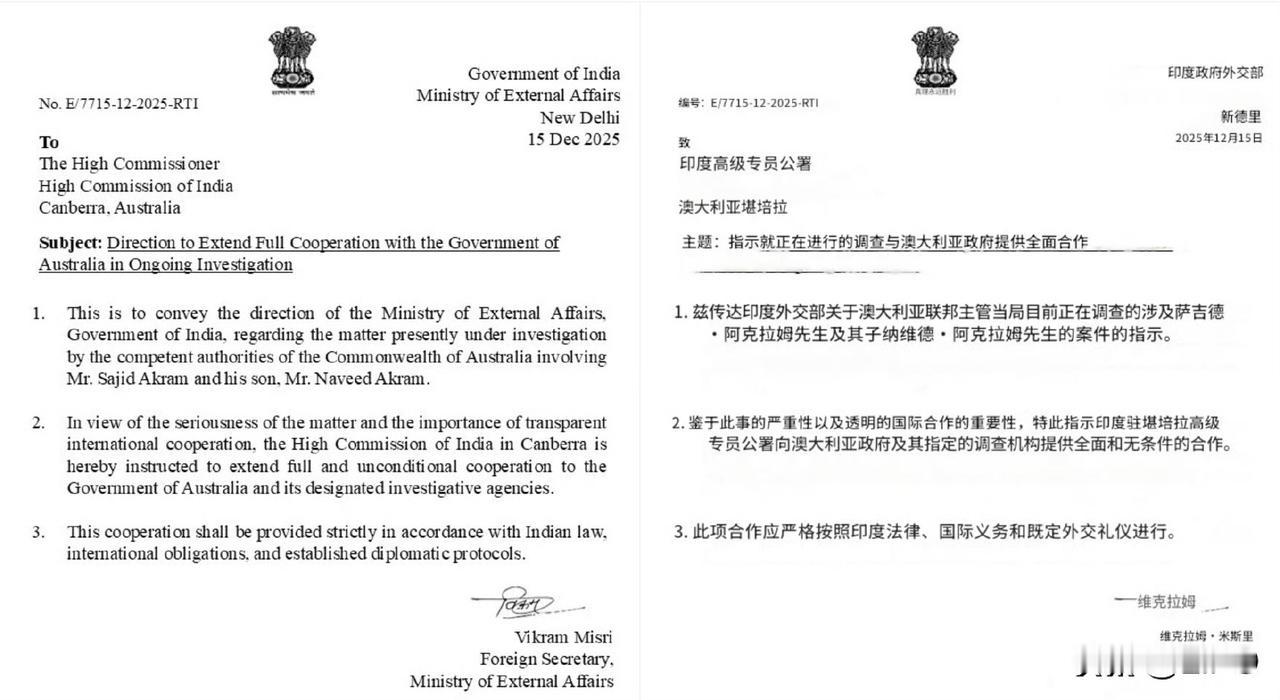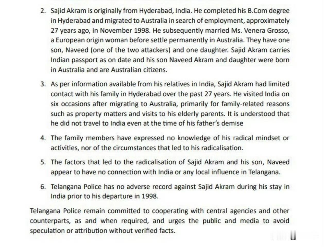 印度特伦甘纳邦警方官员确认,悉尼邦迪海滩袭击事件的两名枪手之一萨吉德·阿克勒姆(50 岁)来自印度海德拉巴,他最后一次回到印度是在 2022 年。他在海得拉巴完成了商学学士学位,于 1998 年持学生签证移居澳大利亚。随后与一位欧洲裔女子维内拉·格罗索女士结婚,之后在澳大利亚永久定居。他们育有一子一女,儿子纳维德(两名袭击者之一)。截至目前,萨吉德·阿克拉姆持有印度护照,他的儿子纳维德·阿克拉姆和女儿均出生于澳大利亚,是澳大利亚公民。