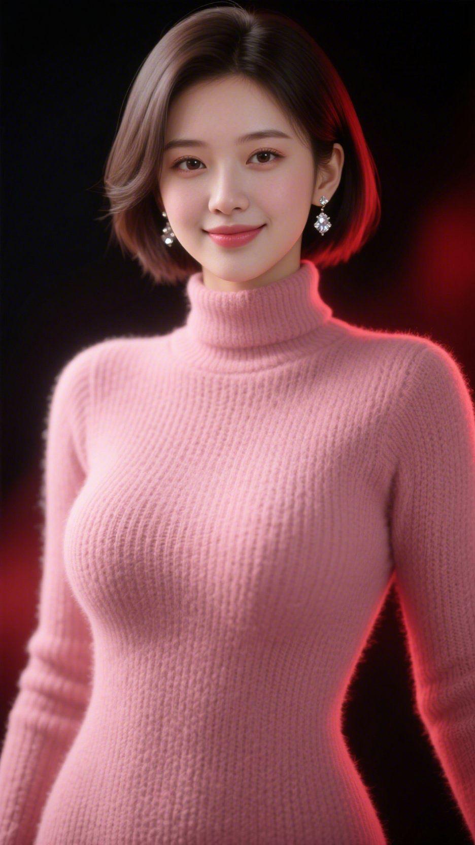 《粉绒暖意裹清柔》 暗境里漾开的粉,是将云絮织作了绒衣的暖——这袭高领针织,像裹了半捧春日软樱,细密纹路顺着肩颈轻铺,软得如落了浅绒的风。 短发是裁过的月辉,发梢沾着淡红的光,耳间碎钻亮得恰好,如星子轻缀在笑边。眉目舒展得像春夜的月,立于暗里,却把暖意漫得周身都轻。 温柔从不是浅淡的色,是绒线裹住的软、是笑意里藏的温——像冬夜窗沿的灯,望之便觉周身覆了软绒,连呼吸都沾了粉调的甜,落进心里,便成了化不开的暖。 冬日柔穿搭 氛围感气质