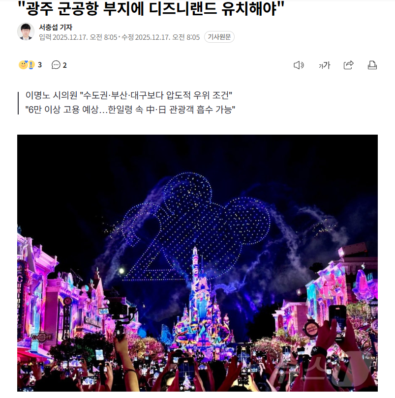 【韩国光州市议员提议引“迪士尼乐园”,选址为光州军用机场旧址】海外新鲜事热点现场 在韩国光州军用机场搬迁TF会议即将举行首次会议之际,有研究结果显示,作为该地块利用方案之一而备受关注的世界级主题公园"迪士尼乐园",其选址条件比首都圈等其他地区更为有利。尤其在国际局势中,中国因"限日令"已完全中断与日本的旅游往来,此时有主张认为光州迪士尼乐园可以吸引中日两国的游客。17日,据光州市议会透露,光州市议员李明洙(西区3号)最近在光州市议会政策研究委托项目最终报告会上,公布了"光州迪士尼乐园引进战略"。由光州科学技术院(GIST)郑相虎博士负责的此项研究提出,作为能够打破持续人口减少危机的对策,应引进"超级内容"迪士尼乐园。研究结果显示,目前跌破140万、为139万的光州人口预计到2045年将降至115万。每年有7000名青年人口流失,空置率达14.2%,高于全国平均的9.2%,亟需新的增长动力。特别是,光州的旅游指标中,平均停留天数为0.8天,人均消费为7万韩元,在五大特别广域市(广域市)中排名垫底。甚至比有"无趣城市"之称的大田(停留天数1.3天,人均消费8万韩元)还要低。停留型游客比例方面,与全国平均56.5%的游客停留2天以上相比,光州仅为19.2%,被认为是"留不住人的城市"。"光州迪士尼乐园"的预期效果包括:提升约35万亿韩元的城市品牌价值、产生12.4万亿韩元的经济循环及生产效应、创造超过6.5万个优质青年就业岗位、吸引国内外游客超过2000万人次等。特别是,其选址条件远优于首都圈或釜山等其他地方自治团体。规模达248万坪(约819万平方米)的光州军用机场旧址是汝矣岛的2.8倍,远大于首都圈替代用地(120万坪)、釜山产业园区(85万坪)和大邱创新城市(110万坪)。据该议员解释,即使按照部分提议建设市民森林,土地也绰绰有余。地形方面,相比丘陵、斜坡和分散的其他地区,此地为平原,便于统一开发。KTX松亭站位于1公里以内,距离光州机场和务安国际机场也很近。若连接月光铁路,2小时内即可通达全国,并与松亭、尚武等商业区相连。分析认为,当前讨论的大规模公寓园区建设预计能带来6万亿韩元的一次性出售收益,而迪士尼乐园则预计每年可带来1.4万亿韩元的旅游收入。税收效果方面,比起预计能产生1200亿韩元一次性税收的公寓销售,迪士尼乐园预计每年可带来8350亿韩元的地方税和国税收入。虽然在光州大部分地区开发公寓可能会加剧市中心空洞化,但迪士尼乐园在促进消费方面效果显著。关于建设计划,可通过三个阶段投资计划,在总计10万亿韩元投资中,安排国家预算3万亿韩元、地方政府2万亿韩元,并通过迪士尼方面投资3万亿韩元及民间投资2万亿韩元来筹措。该议员强调:"虽然中国上海、香港和日本东京都有迪士尼乐园,但目前由于中国的'限日令',两国关系冻结,旅游已中断。""如果光州有迪士尼乐园,就像韩国在东北亚扮演中间人角色一样,光州也可以成为吸引两国游客的缓冲地带。"然而,有观点指出,要将迪士尼乐园引进光州,首先需要确认迪士尼方面的意向,并且必须先明确需要克服的诸多课题,例如吸引外国游客的计划、在盈利性方面缺乏吸引力等。