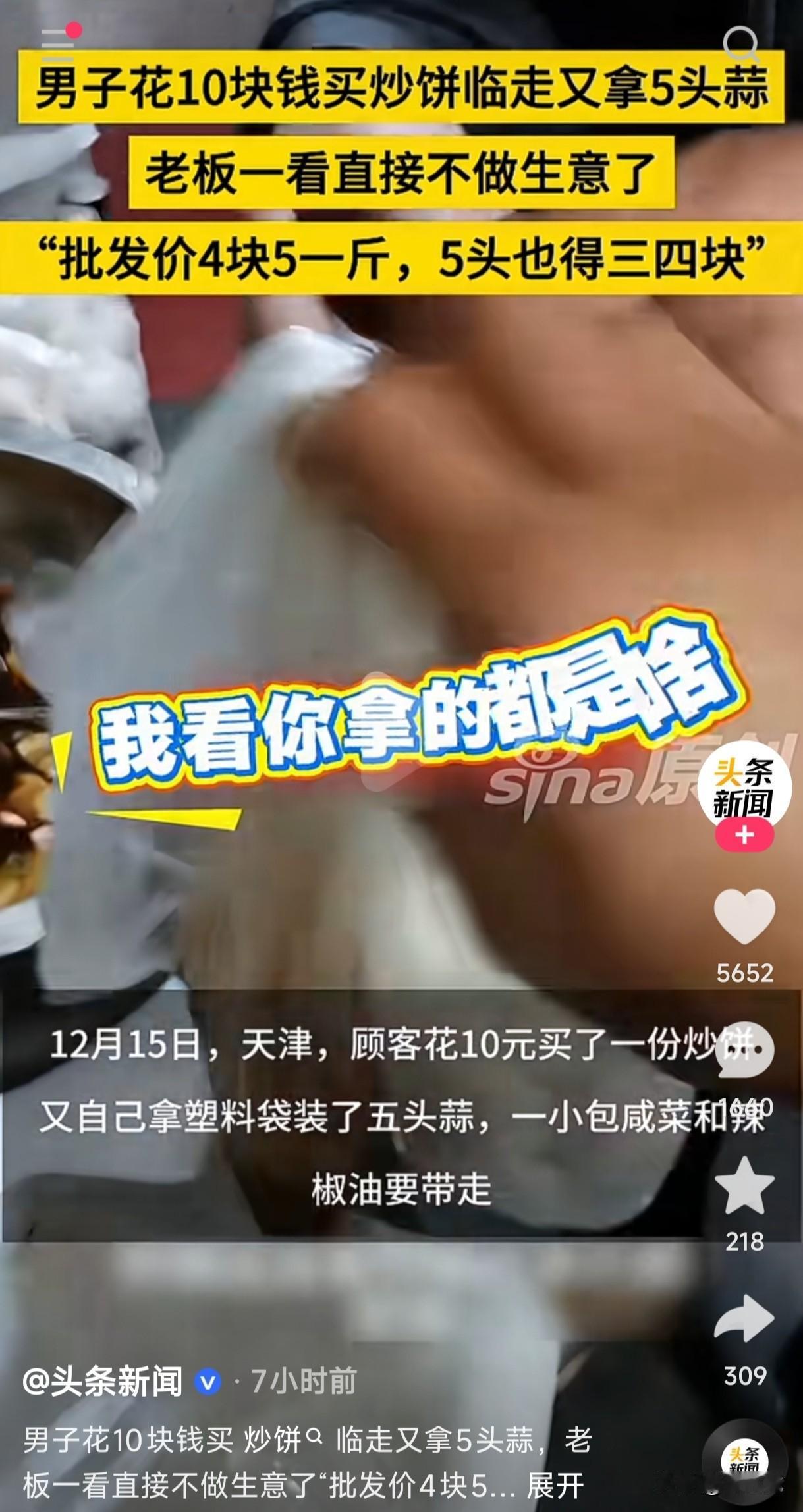 男子花10块钱买了一份炒饼,又自己那塑料袋装了5头蒜,一小包咸菜和辣椒油要带走,老板一看直接不做生意了。 人心不足蛇吞象,10块钱一份的炒饼居然拿那么多大蒜,大蒜最便宜一斤也要五六块钱,这一份饭老板还有的挣吗?这要是搁我身上我也不愿意卖了,这哪里是来买饭的,这分明是来占便宜拿大蒜来的吗?装咸菜和辣椒油可以理解,那一点点也值不了多少钱,饭店提供那些本来就是让人吃的,就是吃多少也觉得没什么,但拿那么多的大蒜他一次性能吃完吗?他这是借着买饭的名头故意到饭店拿免费的大蒜吗?这种人宁愿不做他生意也不给他惯这毛病。 有些人说是老板格局小了,大蒜不就是让人吃的吗?先不说大蒜的价格多少,哪个人吃饭一次性能吃5头蒜,这明摆着不是故意贪便宜的吗?难道他是以买饭的名义拿5头蒜让全家人一起吃吗?