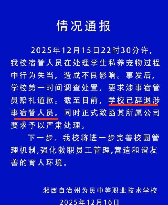 对于湖南职校的摔猫事件,宿舍教官和学生双方都有不可推卸的责任! 事情发生在12月15日的晚间,当时都已经晚上10点多了,宿舍的教官开始例行宿舍检查。 学校规定是不允许将宠物带到宿舍的,可偏偏碰到了一个学生将小猫带到了宿舍。 当被查到违规带宠物进宿舍时,这名男生的态度还比较收敛,立即承认错误,声称明天会交给班主任处理,并且当着宿舍教官的面给班主任打了电话来现场协调。 本以为这件事就这样结束了,班主任来了把小猫带走就结束了,可意外的事发生了。 这个小猫因为受到惊吓,躲到了床底下不出来,这名宿舍教官在捉小猫的时候和该名学生有了肢体碰撞。 此时事件开始升级! 教官在捉猫的过程中声称,小猫要不立即处理要不直接摔死, 而这名学生也失去了理智,扬言你要不敢摔死就把猫还我, 此时的学生拿着手机对着宿舍教官进行拍照, 并持续的语言攻击, 你摔呀,你摔呀, 你要是不摔你就是个怂包....... 而此时的班主任已经赶到宿舍, 协调说:现在我把现在把猫带走, 而该名男生情绪非常的激动, 重复的说道:要不你要猫摔死要不把猫还给我, 班主任的协调并没有奏效。 这个时候,宿舍的教官也被彻底激怒了, 他把猫给同事拿着,自己脱掉了教服, 然后当着学生的面把小猫重重的摔在了地上, 小猫在一分钟内被重摔了两次,被摔死后扔在了黑色垃圾袋里。 这场争吵,小猫作为弱势成为最大的受害者。 12月16日,学校立即对此事做出判断,将该名宿舍教官辞退。 但这场关于虐待小动物的事件还在持续的发酵....... 从视频中可以看出, 该名学生违规、主动挑衅、设局挑事等行为,也是负有责任的, 班主任已经到达宿舍,按照正常推理,学生的行为该由班主任负责了, 可是该名学生还在持续的挑衅,宿舍教官也在矛盾激化中情绪升级, 都没有把班主任这个重要的角色放在眼里, 这也是导致这起矛盾激化的主要原因, 学生不该挑衅, 而宿舍教官做为成年人,应该有能力通知自己的情绪,强化自己的管理能力, 此时应该有更好的解决办法,而非走最极端的行为, 宿舍教官此时已经被学生的语言激怒了, 但作为成年人,特别是在管理学生时, 是必须要能管理自己的情绪的,不然后续也会出现不可控的乱子。