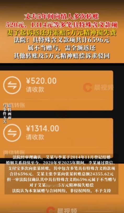 宁夏银川,一已婚男子,和一年轻貌美女子发展为不正当男女关系,男子过着家里红旗不倒,外面彩旗飘飘的逍遥生活。5年期间,他向女子转账520等含特殊意义的红包共6596元。不成想,两人的关系被男子妻子撞破,男子马上反水,写下《说明书》列出转账清单,并配合妻子起诉到法院,要求对方返还全部所赠钱款,以及5万元精神损失费。女子委屈的哭诉:男子频繁向她借钱周转,至今还欠着她2万多元。法院经过一审、二审,这样判了! 数字不会说谎,但人心会,银川男子李某与妻子艾某结婚十余年,在外人眼里是和睦的一对,可李某的手机里,藏着另一番天地。 2020年,他认识了张某,几句花言巧语下肚,两人便跨越了婚姻的边界。 接下来的5年里,李某用一种最直接的方式维系着这段不正当关系:逢年过节、生日纪念日,总会给张某转去带有特殊含义的钱款。 2020年8月的520元,是试探;2021年张某生日的999元,是“长长久久”的许诺。、 情人节的888元,是讨巧的讨好;还有那组连转的520+1314元,更是把“一生一世”的谎言说得煞有介事。 5年时间,这些带着“爱意”的转账累计6596元,李某以为,用这点钱就能买到婚外的浪漫,还能守住家里的安稳。 可他忘了,所有的欺骗都有露馅的一天,2025年,艾某在整理丈夫手机时,无意间看到了这些刺眼的转账记录和暧昧聊天。 那些本该属于夫妻二人的共同财产,被丈夫偷偷拿去讨好别人;那些本该只对自己说的情话,却出现在另一个女人的对话框里。 崩溃过后,艾某想讨个说法,可李某的反应让她彻底寒了心,他没有丝毫愧疚,反而立刻和张某划清界限,连夜写下一份《说明》。 这份《说明》里,李某详细罗列了给张某的每一笔特殊含义转账,直言这些钱是夫妻共同财产,自己未经艾某同意擅自赠与,还承认了两人的不正当关系。 这份“反水”的证据,成了艾某起诉的关键,她将张某告上法庭,要求返还李某转账的全部24355.62元,还提出了5万元的精神损失费。 艾某因为丈夫长期的背叛和欺骗,已经让她患上了重度焦虑和抑郁,然而法庭上的对峙,更像是一场人性的暴露。 艾某拿着《说明》和转账记录,控诉张某侵犯了自己的婚姻和财产权益。 然而张某却红着眼眶辩解,那些不含特殊含义的转账根本不是赠与,而是李某一次次找她借的周转资金。 扣除那6596元“爱意红包”,李某至今还欠她20500元,她提交的借条和转账凭证足以证明。 一边是原配的婚姻创伤与财产诉求,一边是第三者的“被拖欠”与委屈,这场官司从一审打到二审,焦点始终围绕着“转账到底是赠与还是借款”“精神损失该谁买单”。 而法院的判决,给出了清晰的法律边界,法院认为,李某在婚姻存续期间,未经妻子同意擅自处分夫妻共同财产,还用于维系违背公序良俗的婚外情。 那些520、1314元等带有明确爱意指向的转账,显然属于无效赠与,张某必须返还这6596元。 但对于艾某主张的其余1.7万余元,因为缺乏足够证据证明是赠与,且张某提交了借款证据,法院没有支持。 至于5万元精神损失费,由于案件属于赠与合同纠纷,核心是处理财产权益,而非侵权责任,除非另案起诉并证明心理伤害与张某的行为有直接因果关系,否则难以获赔。 《民法典》明确规定,夫妻对共同财产享有平等处理权,非因日常生活需要的处分,必须双方协商一致。 那些特殊含义的数字,之所以能成为铁证,是因为它们直接戳破了“正常经济往来”的谎言,证明了转账的爱意属性。 而大额普通转账,只要超出了合理的生活范畴,再加上丈夫的自认,就足以认定为无效赠与。 李某为了自保,不惜出卖曾经的“情人”,用一份《说明》将所有责任推给对方。 而张某,即便真的被拖欠款项,也因为卷入婚外情,让自己陷入了维权的被动;艾某和小吴,赢了官司,却再也找不回曾经的信任和完整的婚姻。 这场围绕“爱情转账”的闹剧,没有真正的赢家,它告诉我们,婚外情里的所谓“爱意”,往往掺杂着算计;那些用共同财产堆砌的浪漫,终究会被法律和道德戳破。 520、1314再浪漫,也抵不过一份忠诚的婚姻;转账的数字再诱人,也换不来真正的安稳。 法律能厘清财产的归属,却修复不了破碎的感情;能判定赠与的无效,却填补不了信任的裂痕,说到底,婚姻的核心从来不是数字和金钱,而是责任与忠诚。