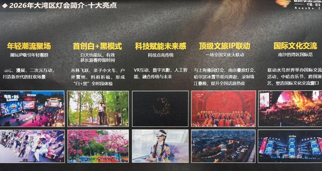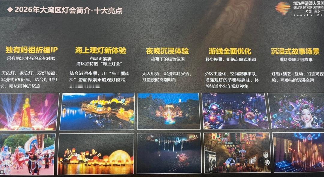 【2026大湾区灯会提前剧透!大湾鸡、鳌鱼等都会亮相】“潮涌湾心,港澳同行”南沙采风活动举行。交流会上透露2026年粤港澳大湾区灯会将于2026年2月10日-5月10日在南沙举行。 更加重磅的是2026年大湾区灯会动线图、意向图首次曝光,十五运会吉祥物喜洋洋、乐融融(大湾鸡)将亮相灯会,同时还有中国上古神话中的鳌鱼、小蛮腰等大湾区城市地标等。 按照游客动线图,主游线长约2.5公里,整个灯会分为五大组团,分别是星河驰骋·骏马腾云、绿野仙踪·生态和鸣、逍遥天地·数智未来、千年一梦·烟火人间、同根同源·湾区和韵。 本届灯会植入更多科技、光影元素,同时大湾区灯会将与上海豫园灯会、南京秦淮灯会、哈尔滨冰雪节等顶级IP联动,双向奔赴,录制珠江春晚,将灯会锻造为世界级地标性文旅IP。 灯会凸显十大亮点,包括有妈祖祈福IP,海上观灯等南沙独有的观灯要素,本次灯会的游线也全面优化,分区主题化让整个游览更加顺畅,另外还引入了目前很火的沉浸式故事场景,加入NPC的演艺和互动环节,让游客可以参与其中。首创白+黑模式,白天也能逛灯会。另外还加入了VR互动、数字光影、人工智能等等要素。 灯会还会推出购票优惠,部分日期最低优惠或高达五折,不过具体票价没有公布。大家觉得这次灯会票价会是多少呢?