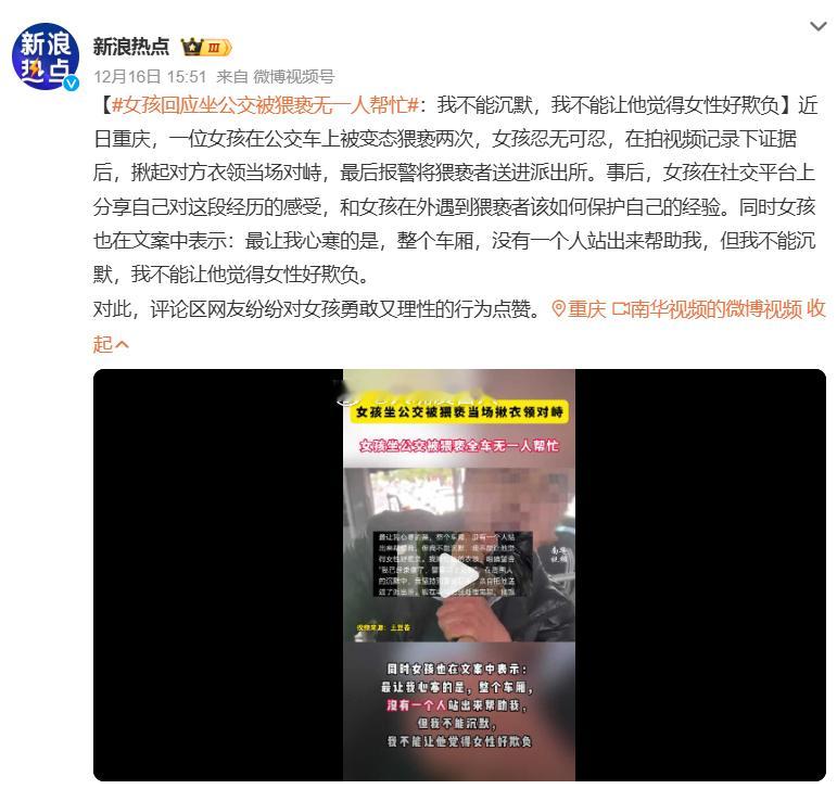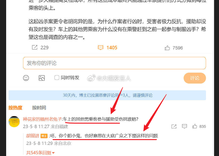 女孩回应坐公交被猥亵无一人帮忙 1. 想起胡锡进对某事件的一条评论、批评没有男人见义勇为(图1),2023年5月胡锡进在微博中说到,歹徒在列车上持刀行凶、援助没有及时发生,进而胡锡进批评车上的男性乘客,为什么没在乘警赶来之前一起参与制服凶手2. 评论区高赞评论问老胡,“车上的其他男乘客参与援助受伤找谁赔”(图3),老胡很快回答,“吓,你个胆小鬼,也好意思在大庭广众之下提这样的问题”3. 你明白为什么有些老登让人讨厌了吧。因为Y泼辣。热点观点23岁男子公交车猥亵女子被行拘,