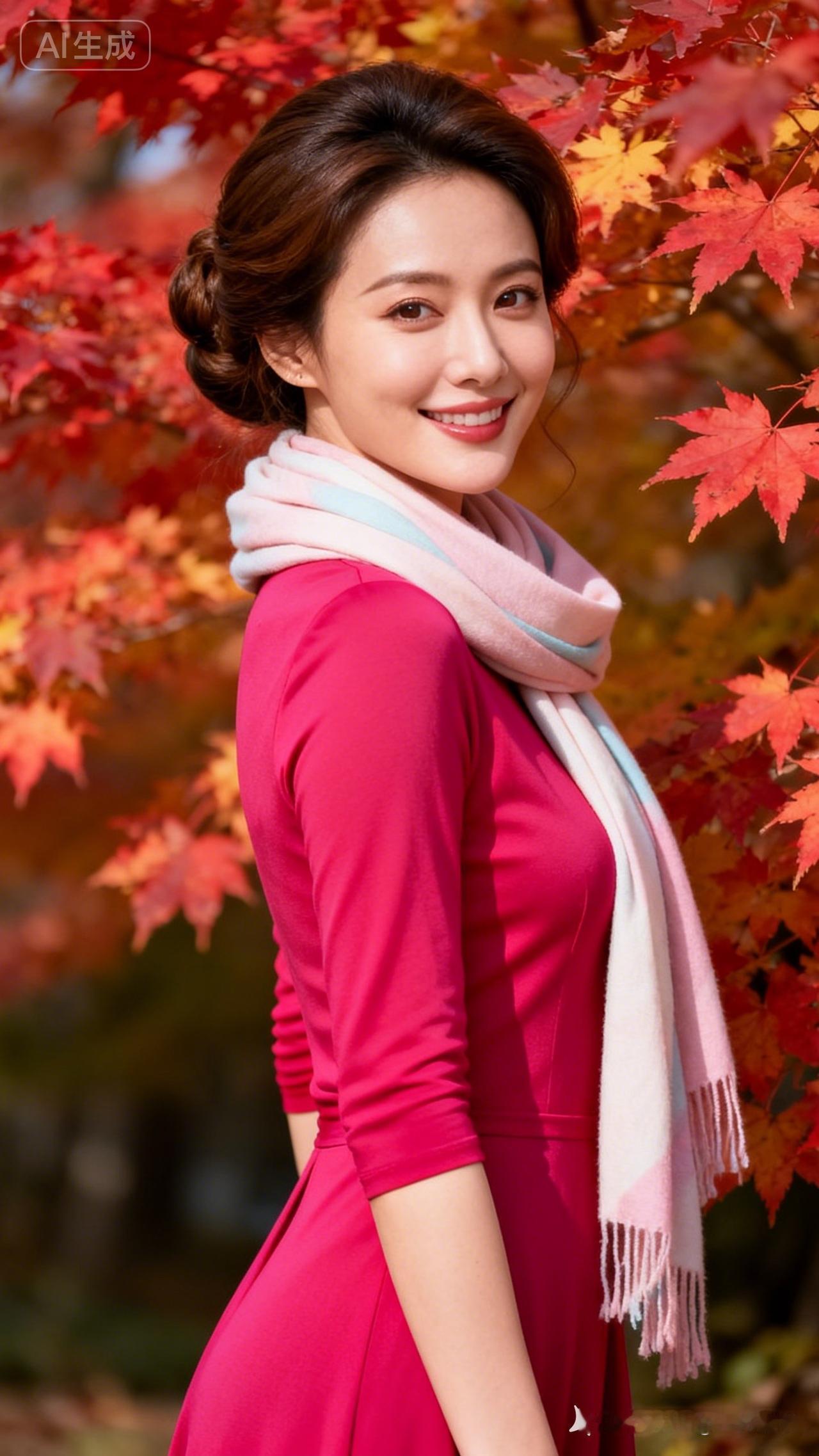 秋日暖阳下,红裙与枫叶相映成趣,微笑的少女,温暖如秋阳。