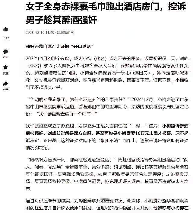广东中山,一女子接受刚认识仅一天的男性邀请,前往私人会所聚餐饮酒,结果醉酒后被对方带到酒店,强行发生了关系。女子趁对方接电话之际,全身赤裸裹毛巾跑出酒店房门,呼喊求救,怎料警方将对方抓获后,因对方始终说与女子之间系自愿,检方最终以事实不清、证据不足为由,对对方作出了不予起诉的决定。女子难以释怀,随后向检方申诉。检方核查中发现问题!最终将对方送进监狱,还女子一个公道! 这名女子叫小梅,她的遭遇始于2022年4月。男子刘峰在初次见面后,仅隔一天便以“多人聚餐”为名,将她约至一家私人会所。期间刘峰不断劝酒,小梅不慎醉酒,意识模糊之际被带往酒店遭受侵犯。 小梅趁刘峰接电话的间隙,裹着毛巾冲出了房间,在酒店走廊大声呼救,这一幕被闻声而来的房客和监控摄像头清晰记录下来,警方及时赶到并将刘峰抓获。 面对审讯,刘峰先是矢口否认发生关系,随后又改口称双方自愿,甚至编造小梅索要10万元未果才报警的谎言。由于现场物证收集存在瑕疵,检察院以事实不清证据不足为由作出了不起诉的决定。 2024年2月小梅走进中山市检察院进行申诉,检察官们重新梳理了案件经过,发现了勘查人员接触呕吐物后未更换手套就提取其他物证,造成证据污染和刘峰称小梅“自愿”使用避孕套和润滑剂,物品却未开封,其辩解自相矛盾的破绽。 酒店监控录像、房客证言与小梅的陈述也能相互印证她受害后惊恐逃离的过程。而刘峰在小梅逃跑后,明知其手机遗落房间,却发送“你去哪儿了”等信息制造自愿假象的行为,更暴露其心虚。 这些证据形成了完整链条,刘峰的强奸罪成立,被判处有期徒刑三年六个月。面对侵害,不屈不挠地维权至关重要。 各位读者你们怎么看?欢迎在评论区讨论。