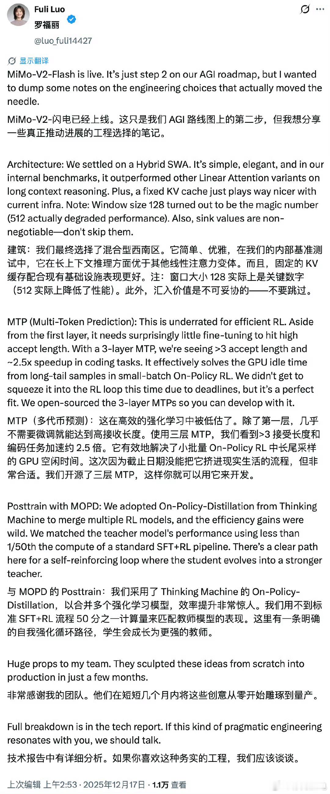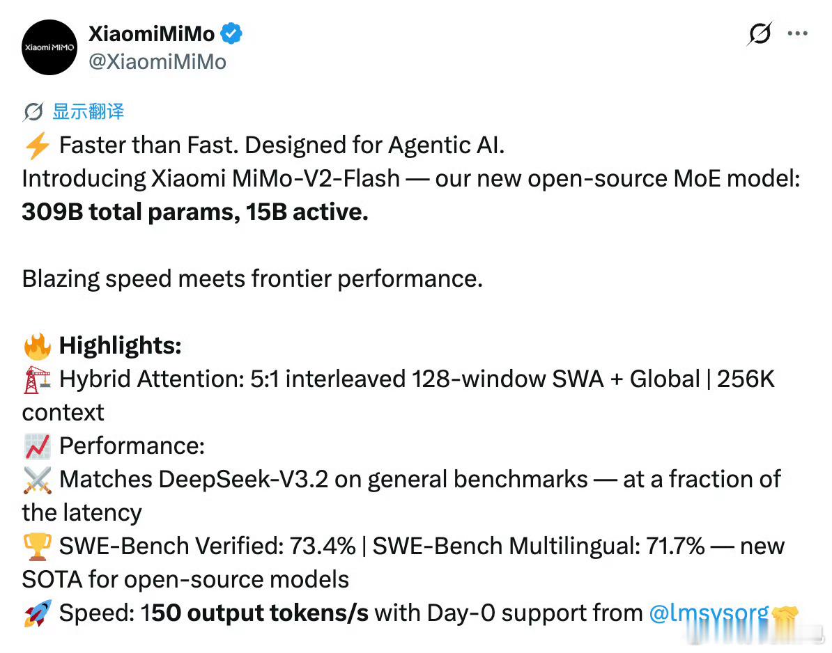 罗福莉首秀,小米自研大模型mimo上线,有了Ai天才少女罗福莉加入,小米大模型这么快就迭代了。小米正式发布并开源新模型MiMo-V2-Flash ,总参数 3090 亿,活跃参数 150 亿,采用专家混合架构 (MoE),性能还能和 DeepSeek-V3.2、Kimi-K2 这些头部开源模型掰掰手腕。反应速度居然比DeepSeek、豆包还快,小米首个推理大模型,建议大家试试,我试了下,确实不错。