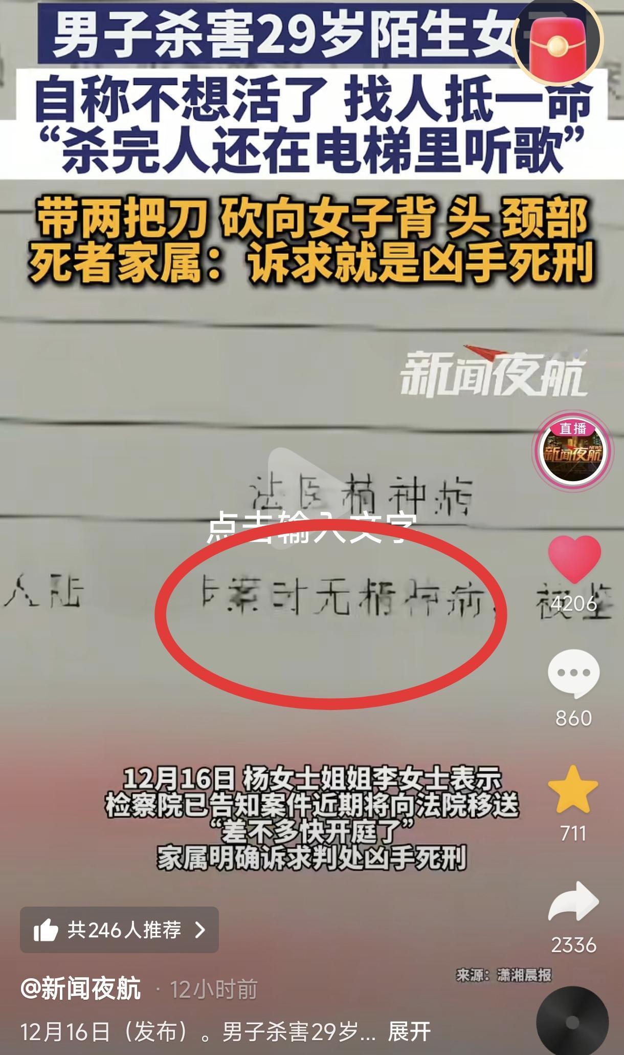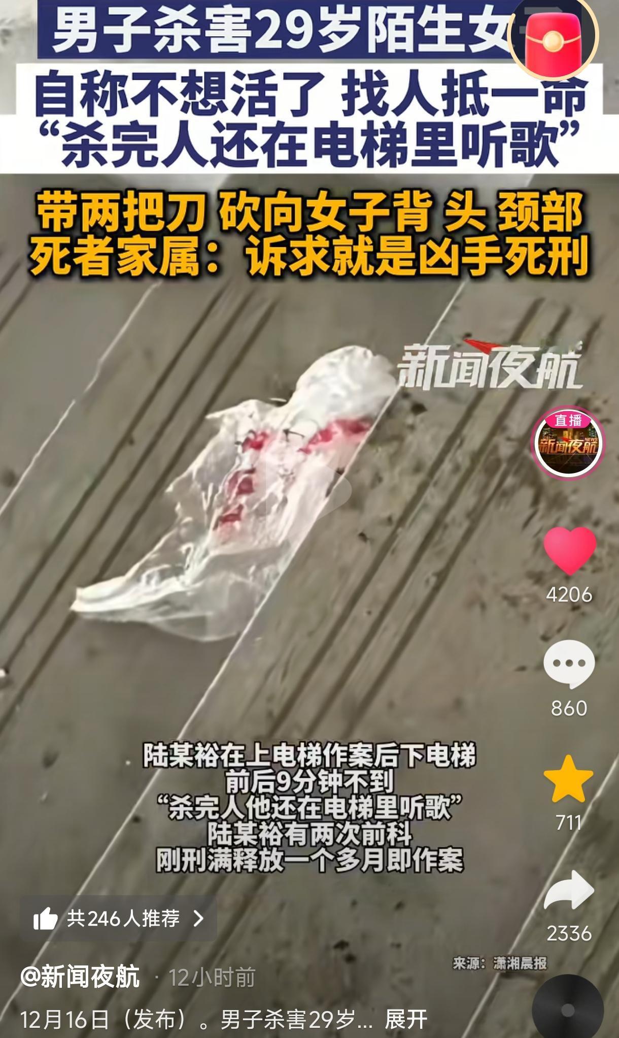 浙江一男子自己不想活了,想找人抵一命,就携带两把刀敲开一家公司的门,9分钟内连捅两名女员工,致一死一重伤,S完人后凶手还在电梯里听歌。当晚他就被警方抓获了,这时他又想活命了,称自己有精神病,但两次申请鉴定均被认定为作案时精神正常,完全具有刑事责任能力,此案即将开庭,希望这种突破人性底线的恶魔早日得到法律的严惩! (来源:新闻夜航) 2025年1月5日晚,浙江义乌的一家公司里,29岁的杨女士正在上班,一位23岁男子陆某裕敲开了公司的门,二话没说就持刀砍向公司女员工杨女士的背部、头部与颈部,等等,致女子倒在血泊中身亡,该公司另一位女同事也被砍成重伤。 这一场突如其来的蓄意持刀行凶案,致一死一重伤,凶手陆某裕仅仅花了9分钟,真是太恐怖了! 关键陆某裕与杨女士、公司女同事均素不相识,毫无任何瓜葛,与这家公司也毫无任何纠纷。 不仅如此,陆某裕行完凶离开该公司,进入到电梯里时还优哉游哉地听起歌来,真是既凶残又变态!然而,天网恢恢、疏而不漏,当晚很快他就被警方抓获了。 警方问其S人的动机,陆某裕竟然无耻地称:“我不想活了,想找人抵一命”。也就是说他这是在随机S害陌生人,心理阴暗至极!29岁杨女士真是太无辜了。 关键这是陆某裕第三次作案了,前面已经有两次了,这次他刚刚刑满释放了一个多月就又开始作案了,真是屡教不改! 然而,他这次犯下的故意S人案,估计也是他人生中最后一次犯案了,他没有放过杨女士,法律同样也不会放过他! 有意思的是,当意识到自己很可能被判死刑时,曾经称自己不想活想找一命抵命的他又想活下去了,就对警方称自己有精神病,还提交了两次精神病鉴定,但两次均被认定为作案时精神正常,完全具有刑事责任能力,这下陆某裕才真正感到后怕。 据新闻称,目前该案件即将开庭,希望凶手早日伏法,以告慰29岁受害者杨女士的在天之灵。 不得不说,这名男子真是太恶毒了,因自己厌世就蓄意报复无辜,9分钟内连捅两名女员工致一死一重伤,事后还淡定听歌,又妄图以精神病脱罪,其行为完全突破了人性底线,更挑战了法律与社会秩序的红线,必须受到最为严厉的法律制裁! 从人性方面看,这完全是典型的迁怒式作恶与极端自私式报复,自己不想活了就可以举起刀砍向毫无瓜葛的陌生人吗?这不就是把陌生人的性命当成自己消极厌世的“陪葬品”了吗?这种对生命的漠视与残害,就是人性中最大、最纯粹的恶! 而作完案后他在电梯里听歌、被抓后又想活命的转变,更加证实了凶手并非精神错乱,而是早有预谋的。他既想通过S戮发泄怨恨,又妄图用精神病作为脱罪工具,完全没有丝毫悔意与人性良知,这种蓄意谋杀行为不得到法律严惩不足以平民愤! 不难看出现今犯案者多妄图以精神病开脱罪责,然而精神病从来不是暴L犯罪的免死金牌,法律对精神鉴定有严格标准,就是为了杜绝凶手滥用借口逃脱惩罚。 此案即将开庭,希望凶手陆某裕得到法律严惩,以告慰惨死于九泉之下的杨女士,维护社会的公平公正。 此案例也给社会警醒:任何妄图践踏他人生命、挑战法律权威的行为,都将受到法律严惩,付出惨痛代价!