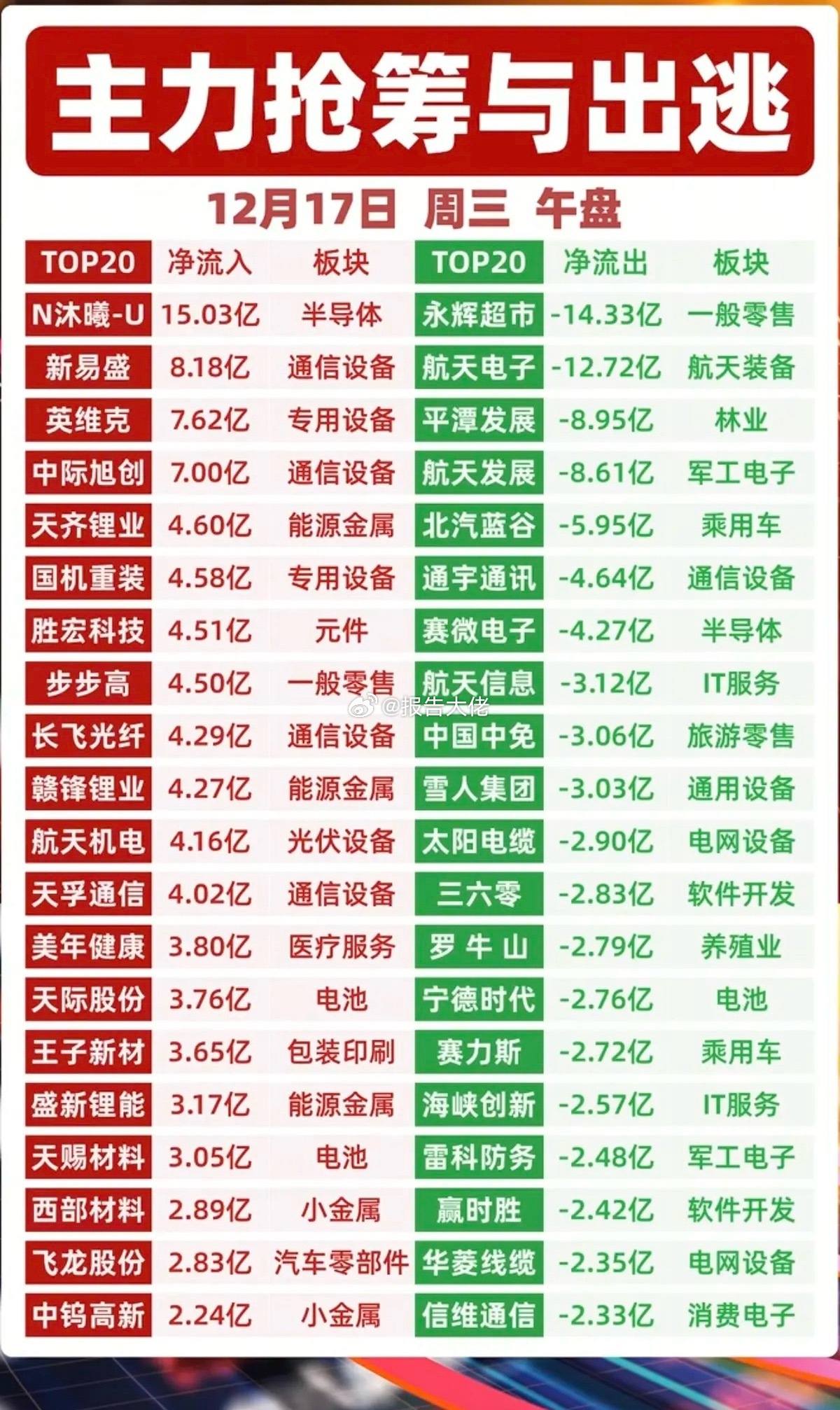 上午盘主力资金 抢筹出逃 个股榜!资金抢筹:有色金属碳酸锂,黄金白银,金属钴,猪肉,盐湖提锂,小金属,工业金属,医疗美容,固态电池等。资金出逃:半导体芯片,海工装备,工业母机,光刻胶,汽车芯片,无人驾驶,机器人板块,超临界发电,可控核聚变等回调出逃