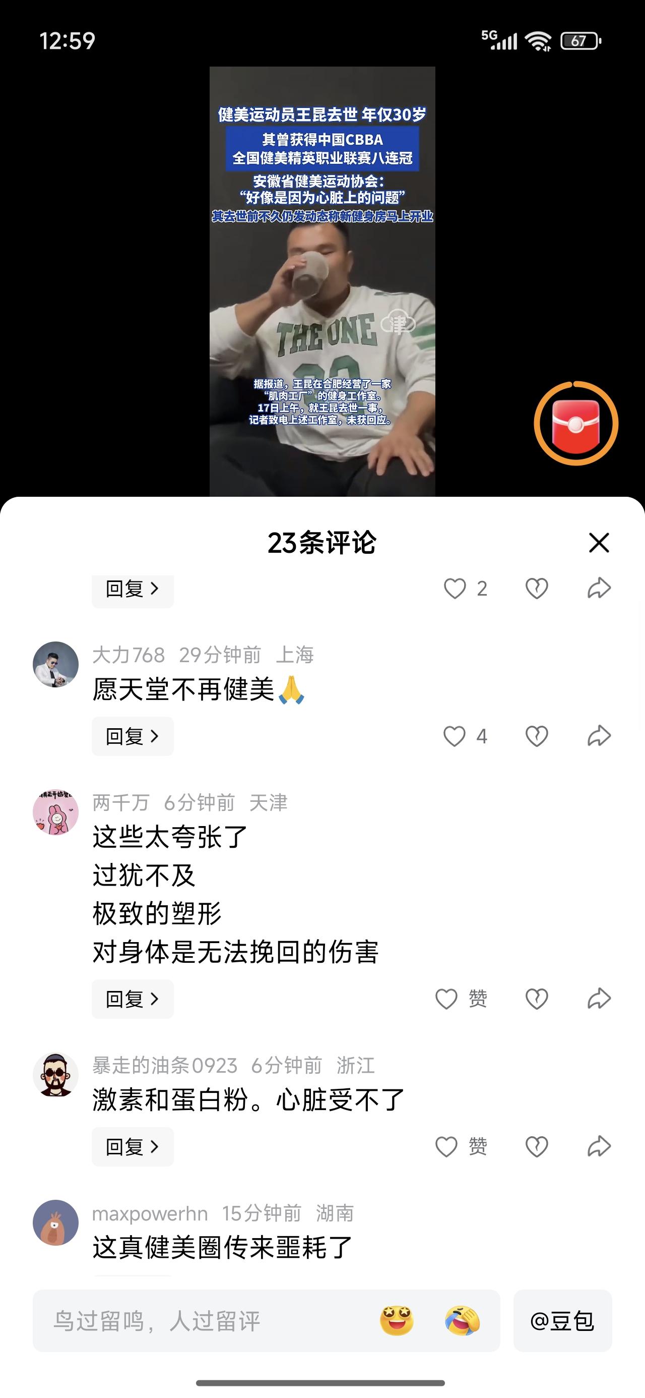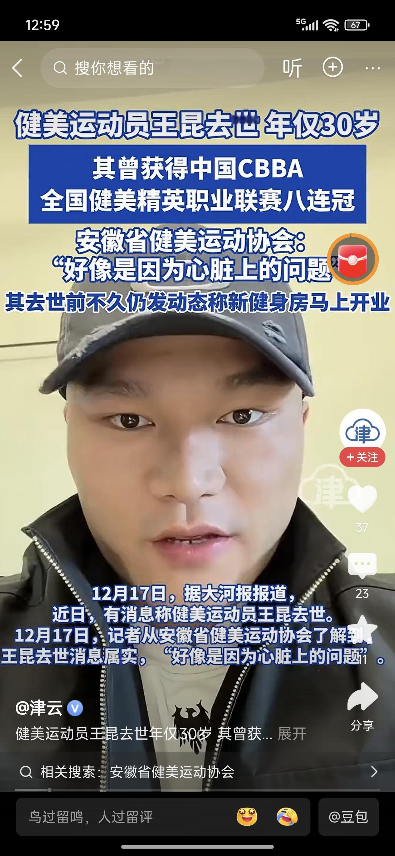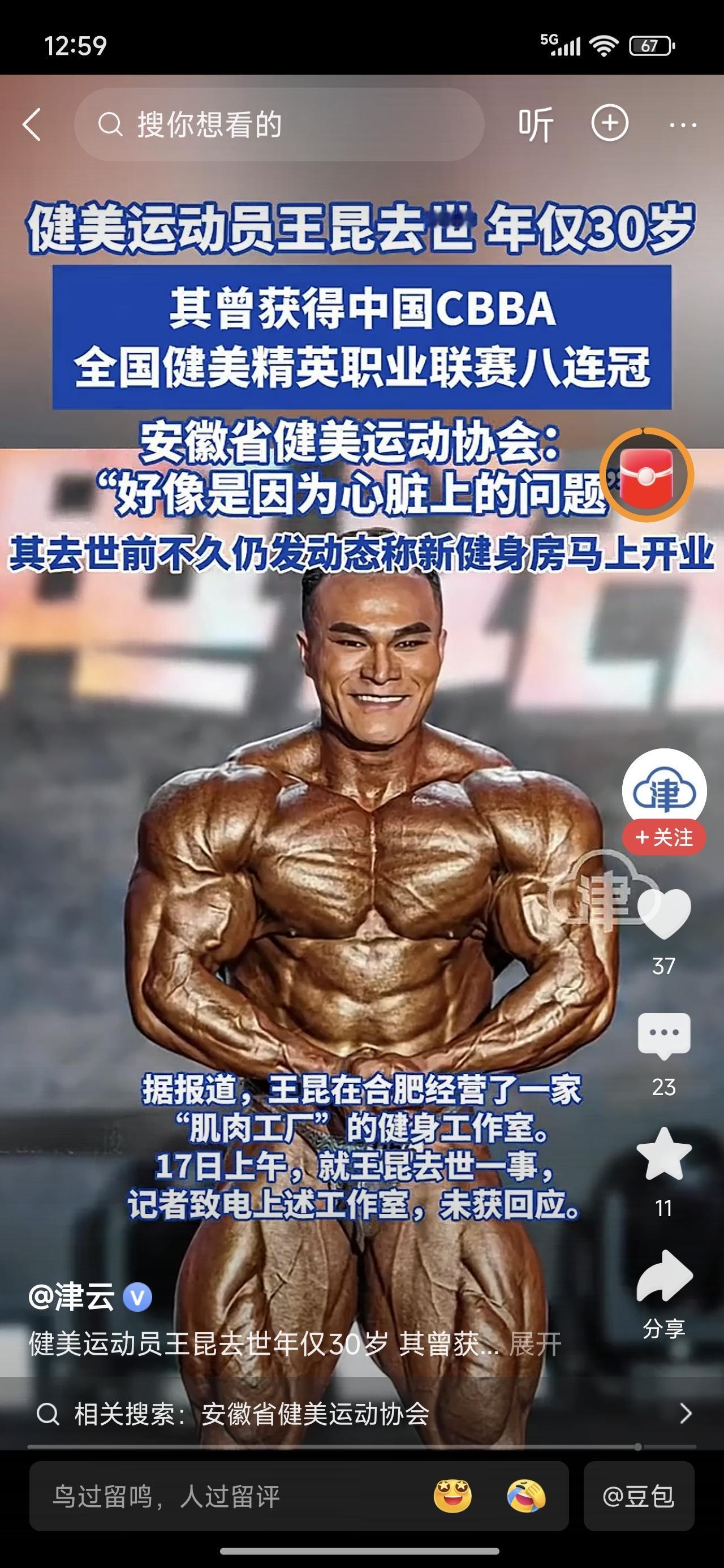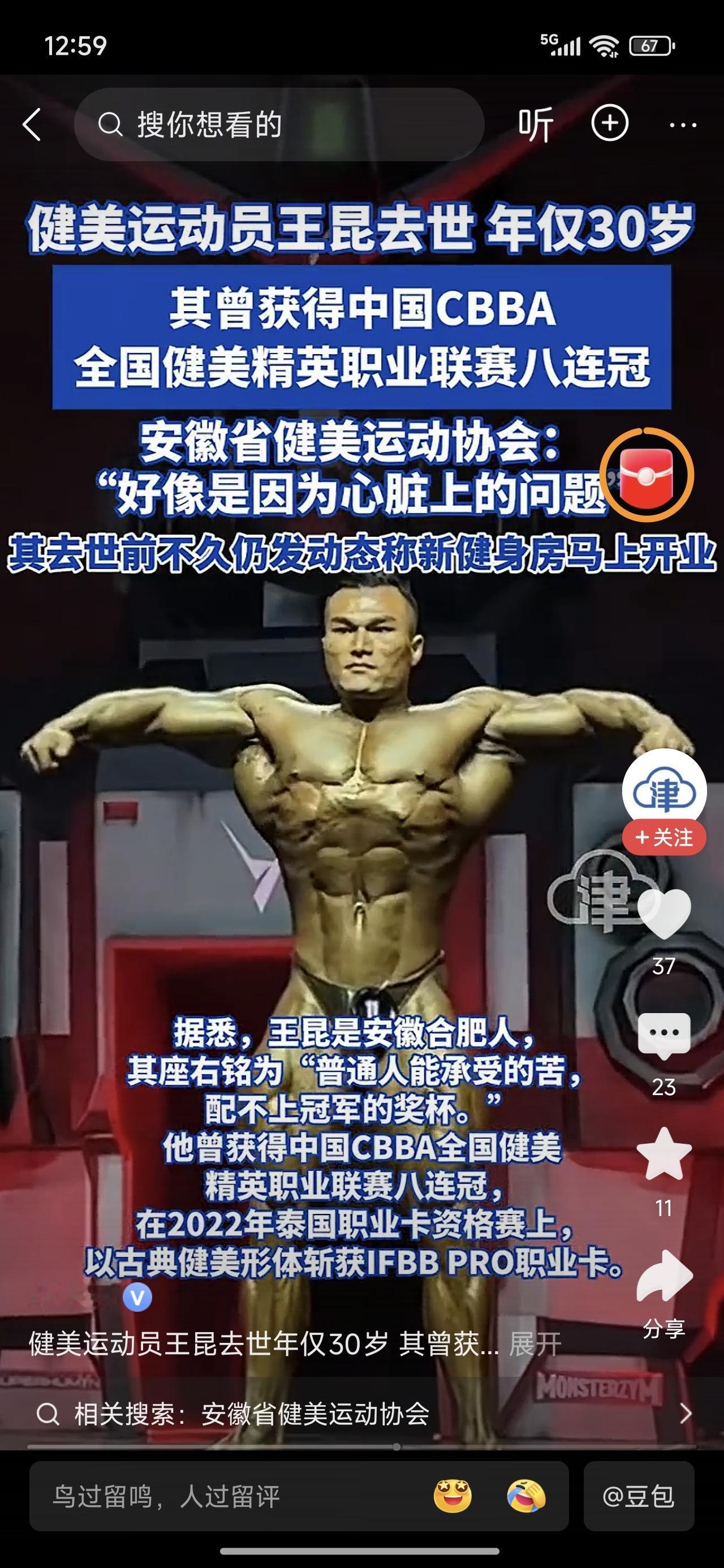 健美圈再传噩耗。九零后健身博主王昆离世。才三十岁。说是心脏上的问题。 曾获得多场次多频次的冠军。图片里有,我也不想赘述了。我认为这玩儿伤身体。也没啥用。小圈子里可能出点名气,实际上没什么用。想要活得久,还是遵循老祖宗的养生之道。 四十岁以前,你就是不养生,也不至于没了吧!练这么些东西,完全没道理。三十岁的年纪,爹妈都可能不到六十岁,咋过啊。 正常吃饭就行了。塞那么些粉儿质啊的。太假大空了。