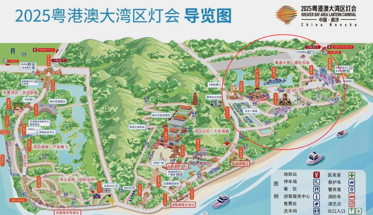 【2026大湾区灯会规模缩小】按照官方公布的2026年灯会游客动线图,主游线长约2.5公里,整个灯会分为五大组团,分别是星河驰骋·骏马腾云、绿野仙踪·生态和鸣、逍遥天地·数智未来、千年一梦·烟火人间、同根同源·湾区和韵。 可以看到本次灯会的规模比起上一届确实有所缩小,按面积算大约缩了三分之一左右。从大角山公园的大门,一直沿着海边过去,然后进入天后宫景区,最远去到天后宫的北门。少了上一届的蒲州花园和天后路的部分。 而可以看到本次灯会覆盖大角山滨海公园和南沙天后宫的小沙滩,意味着这个才升级打通没多久的南沙版情侣路又要打断大半年了!