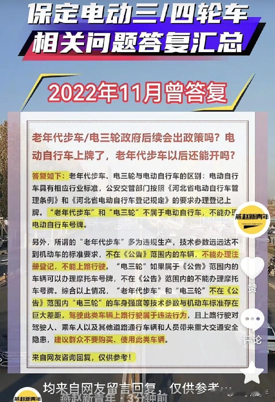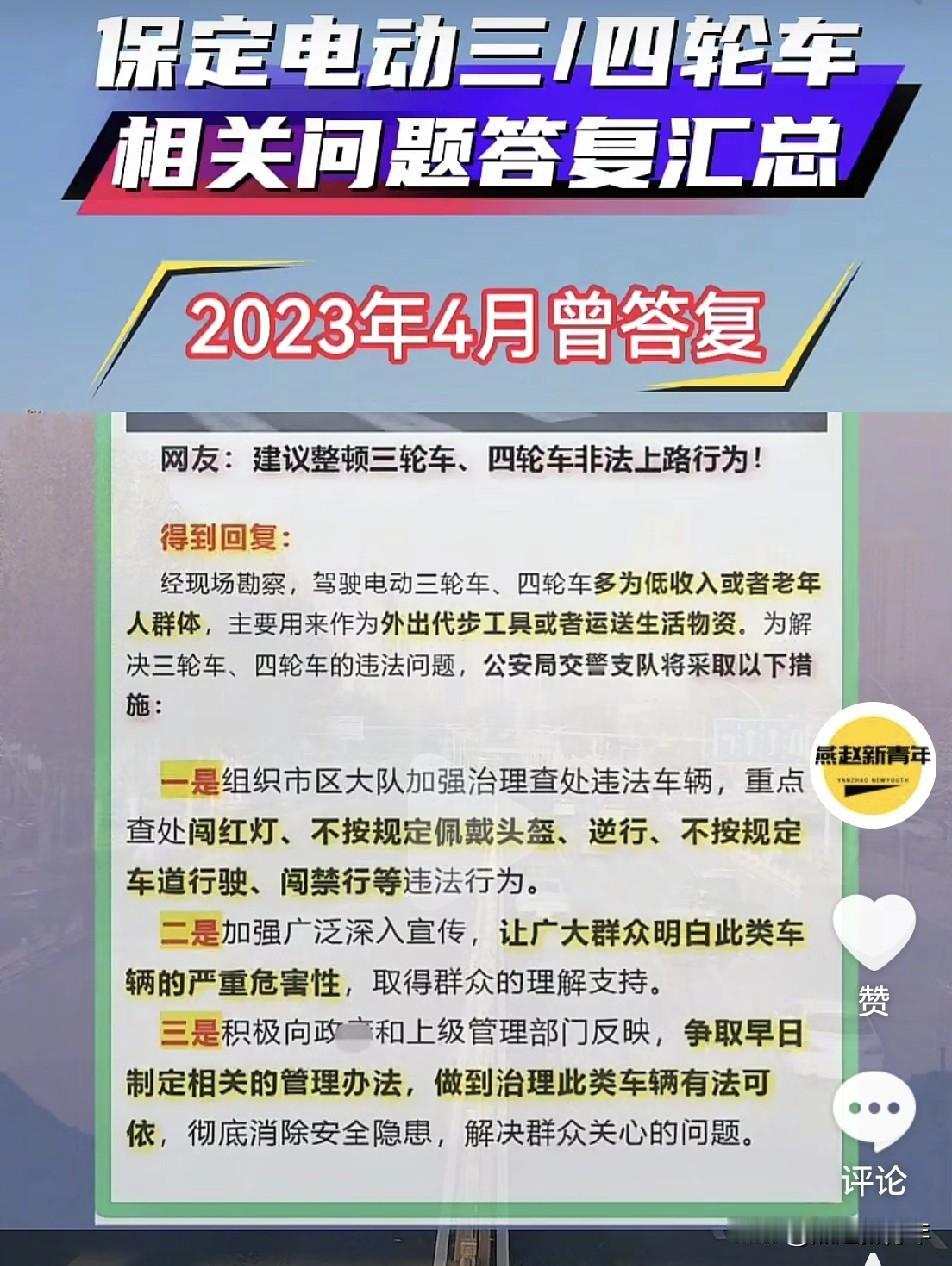 保定关于电动三/四轮车上路相关问题答复的汇总,看来一时半会儿也不好弄…没有相关具体规定做支撑…