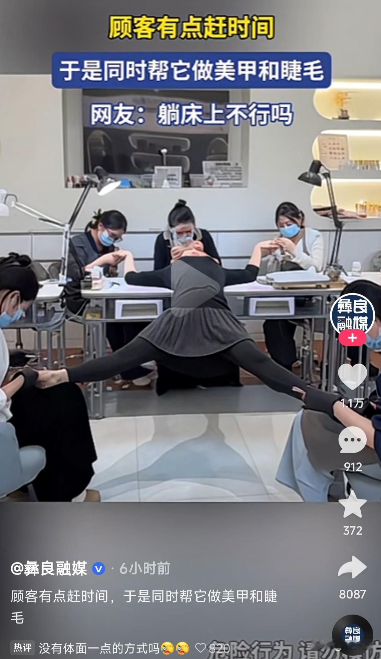 这家美容院没有床吗? 谁见过顾客着急赶时间,这样四仰八叉的躺着同时被5个人服务做美甲和睫毛的? 我想问一般人这样躺着靠在桌子上能坚持多长时间?这位顾客肯定是个练瑜伽的练家子,要不然她也不会坚持这么长时间,双手双脚的美甲还有睫毛,这全部做完也要一些时间吧,这为了变美这定力真是让人佩服。 难道这家美容院里没有床吗?躺在床上被5个人服务不好吗?不知道为什么要这样靠在桌子上?这是真正的为了赶时间?还是为了展示一下她的定力好?或者是这家美容院的服务态度好?