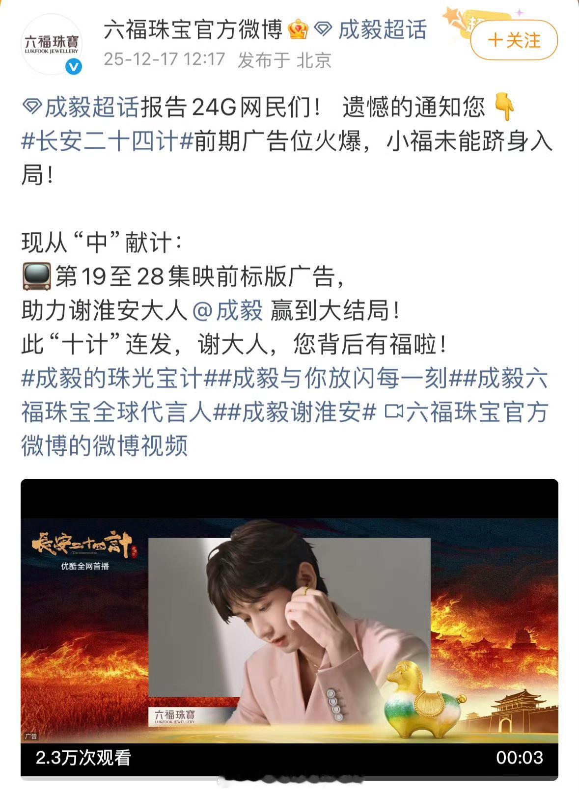 六福给成毅长安二十四计投了10广前期没投的原因是广告位🔥爆,未能跻身入局