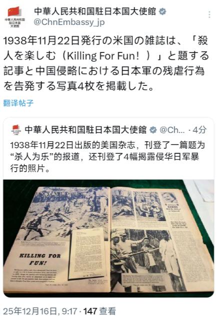 中国驻日本大使馆正式宣布! 12月16日,中国驻日本大使馆用中日文双语写道:“1938年11月22日出版的美国杂志,刊登了一篇题为‘杀人为乐’的报道,还刊登了4幅揭露侵华日军暴行的照片。” 说白了,帝国主义的侵略本性从没变过,光讲道理没用! 12月16日中国驻日本大使馆用中日双语亮出的那份美国老杂志,简直是一记穿越时空的耳光,1938年11月22日出版的《瞭望》杂志上,“杀人为乐”四个大字配上四幅血淋淋的照片,把侵华日军的暴行钉在了历史耻辱柱上。 要知道这可不是我们单方面的控诉,当时美国还在给日本卖石油、废铁呢,完全是中立第三方,可日军的所作所为实在突破人类底线,让人家不得不仗义执言。 那本杂志里的照片有多触目惊心?日本兵把中国平民绑在柱子上当活靶子,一群人围着看新兵练刺杀,脸上还挂着笑意,这哪里是战争,分明是把杀人当成了消遣游戏。 这种行为背后藏着的,正是帝国主义深入骨髓的野心,他们就是想凭着坚船利炮征服世界,烧杀抢掠根本不需要理由,在他们的逻辑里,弱小就活该被欺凌,哪会有半分对受害者的共情。 想想当年中国派出的秘密小组,全是外国友人和日籍正义人士,带着“马吉影片”潜入日本揭露真相,可日军的残暴压根没被撼动,直到被打得无条件投降,才老实了一阵子。 这就说明,对付这种骨子里信奉强权的家伙,光靠摆事实讲道理纯属白费功夫,你得拿出能让他疼的实力,打得他满地找牙,他才会乖乖听你的。 现在还有人觉得应该继续跟某些势力温声细语讲道理,可看看现实就知道有用吗?日本右翼至今还在篡改教科书,否认南京大屠杀,把加害者包装成受害者。 那些说“都过去这么久了还提干嘛”的人,根本不懂历史证据的重要性,美籍华人鲁照宁花了21年在海外打捞史料,从《纽约时报》到《芝加哥每日论坛》,无数西方媒体当年的报道都在印证日军的暴行,这些可不是可以随便抹去的记忆。 有人说“他们不惩罚魔,我们便成魔”,这话听着解气,但真要是不管不顾喊着打过去,把战火引向更多无辜的人,那不是正中某些势力的下怀吗? 老一辈无产阶级革命家们抛头颅洒热血,好不容易换来今天的外交成果和和平环境,可不是让我们用来挥霍的。 拉仇恨叫嚣战争的人,要么是没经历过战争的残酷,要么就是别有用心的坏种,他们忘了战争只会带来流离失所和家破人亡,忘了我们铭记历史不是为了延续仇恨,而是为了守护和平。 中国驻日使馆亮出这份铁证,不是为了挑起冲突,而是为了告诉世界真相不容篡改,帝国主义的侵略本性从未改变。 我们既要手握铁证捍卫历史,也要保持清醒的头脑,不能被愤怒冲昏理智,更不能让别有用心的人利用民族情感。 以上只是个人看法,不代表任何立场,你觉得面对历史铁证,我们该如何平衡铭记与前行?是继续用证据说话,还是采取更强硬的手段?欢迎在评论区留下你的观点。