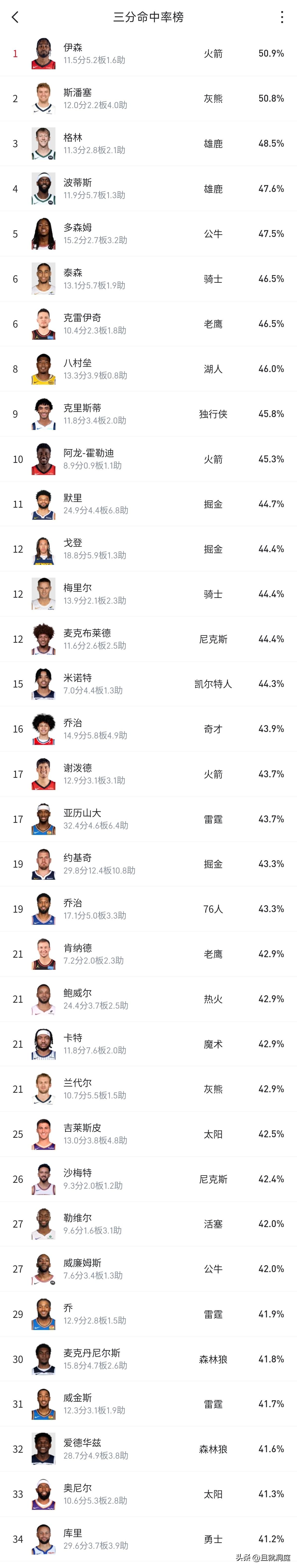 离谱!约基奇本赛季三分球命中率居然超过库里,库里目前有41.2%只能排名第34位。超过50%的现在只有两人,场均得分达到20分及以上的,这个榜单有掘金队莫里44.7%在第11位,亚历山大有43.7%排第17位,约基奇有43.3%排第19位,鲍威尔有42.9%排第21位,爱德华兹有41.6%第32位,然后就是库里了。具体排名如下: