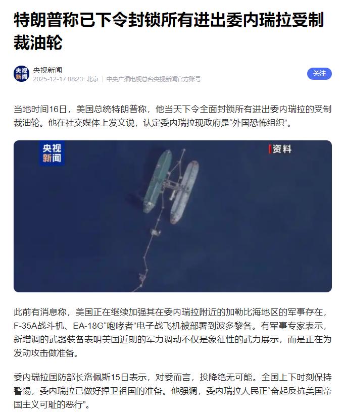 特朗普开始“明抢了”! 当地时间16日,特朗普下了道命令,要全面封锁所有进出委内瑞拉的受制裁油轮,还在网上骂人家现政府是“外国恐怖组织”。 这事儿听着挺复杂,说白了就是美国明着抢委内瑞拉的石油,霸道到了极点! 更让人担心的是,之前美国就已经在委内瑞拉附近的加勒比海增兵了,把F-35A战斗机、EA-18G电子战飞机都派到了波多黎各。 军事专家一眼就看穿了,说美国派这些先进武器不是装样子,是真在为打人家做准备,野心藏都藏不住。 可能有些朋友不知道,委内瑞拉命挺苦,手里有大把石油,本该过得富裕,却被美国折腾得民不聊生。 美国盯着人家的石油好多年了,从2006年就开始制裁,2017年之后更是专挑石油产业下手,还威胁别的国家:谁敢跟委内瑞拉做石油生意,就制裁谁。 这一下就把委内瑞拉坑惨了,原油日产量从190万桶直接跌到35万桶,跌了一大半。后来靠俄罗斯、伊朗帮衬,产量才稍微回升点,但再也没超过100万桶。 这次封锁油轮也不是突然的,特朗普早有预谋。就在几天前的12月10日,美军已经在附近海域扣了一艘大油轮,特朗普还美滋滋地炫耀这是“迄今扣的最大一艘”,直言要把船上的石油留下。 大家想想,油轮在公海上好好航行,美国说扣就扣、说抢就抢,跟海盗有啥区别?委内瑞拉总统马杜罗气得直骂这是“非法的海盗行为”。 转天美国财政部又更新制裁名单,把马杜罗妻子的三个侄子和6艘油轮都加了进去,明摆着就是为了后续多扣油轮铺路,想吓住所有运委内瑞拉石油的船主,让他们不敢动。 有人可能会问,美国为啥非要抢委内瑞拉的石油?答案很简单,就是想把人家的资源攥在自己手里。 委内瑞拉是世界上石油储量最多的国家之一,美国的石油公司早就眼馋了。 之前美国还玩过“打一巴掌给颗糖”的套路,2022年因为俄乌冲突油价涨了,就暂时放松制裁,允许自家的雪佛龙公司回委内瑞拉开采石油,条件是让委内瑞拉按美国的意思搞选举。 没达到目的就立马翻脸,恢复制裁,这说变就变的德性,把霸权嘴脸露得明明白白。 最倒霉的还是委内瑞拉老百姓。石油是他们国家的经济支柱,大部分收入都靠卖石油。 制裁一收紧,石油卖不出去,国家就没钱进口粮食、药品。现在委内瑞拉93%的企业都反对美国制裁,因为制裁一来,工厂停工、工人失业、物价飞上天,老百姓连吃饱饭、看好病都难。 有测算说,要是美国彻底恢复制裁,委内瑞拉得亏16亿美元,相当于全国GDP的1.4%。 这次封锁油轮后,石油出口更难,产量可能几个月内暴跌,老百姓的日子只会更苦。 至于特朗普说人家是“恐怖组织”,纯属瞎扯,就是为抢石油找借口。他还吹牛说委内瑞拉被“南美洲最大舰队围住了”,其实美国在加勒比海派军舰、战机,名义上是“缉毒”,实际就是用武力逼委内瑞拉屈服。 特朗普早就明说过,想占委内瑞拉的石油还不想花钱,现在正一步步把这强盗想法变成现实。委内瑞拉的官员说得对,美国这做法违反国际法,就是明抢人家老百姓的财富。 国际社会都看在眼里,俄罗斯就明确支持委内瑞拉,说要维护人家的主权。美国这种动不动就制裁、扣别人财产的做法,破坏的是全世界的规则,今天能欺负委内瑞拉,明天就能欺负别的国家。 而且这对美国也没好处,现在国际油价本来就不稳定,他这么一封锁,油价只会更乱,影响更多国家。 说到底,特朗普封锁油轮根本不是什么“反恐”“正义”,就是为了抢石油、巩固在拉美的霸权。 这种欺负弱小的霸道行径,不得人心,肯定长不了。委内瑞拉人民不会屈服,国际社会也不会坐视不管,美国要是真敢动手,只会给自己惹大麻烦,让世界更不安定。
