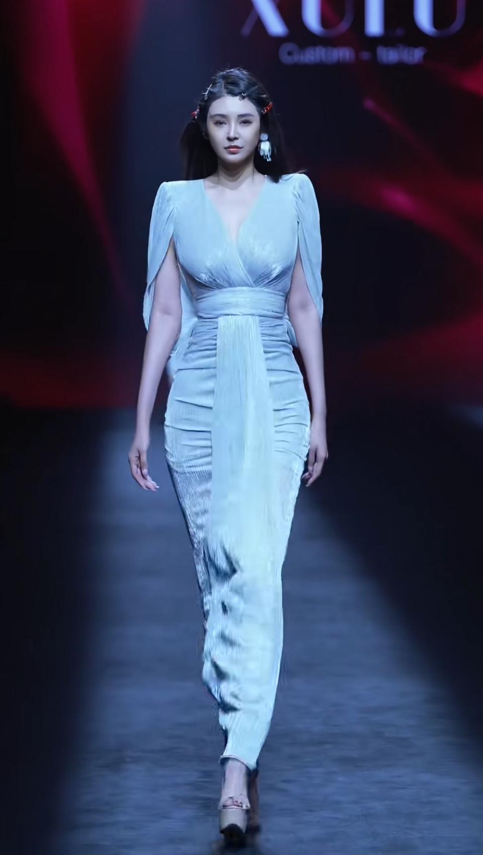 雾蓝裙裾曳着光影,秀场之上,一步一韵皆是东方柔与西方廓形的碰撞,褶皱肌理揉碎了清冷,垂坠的线条又添几分缱绻,XULU的定制美学,在T台中央绽成独一份的风景。