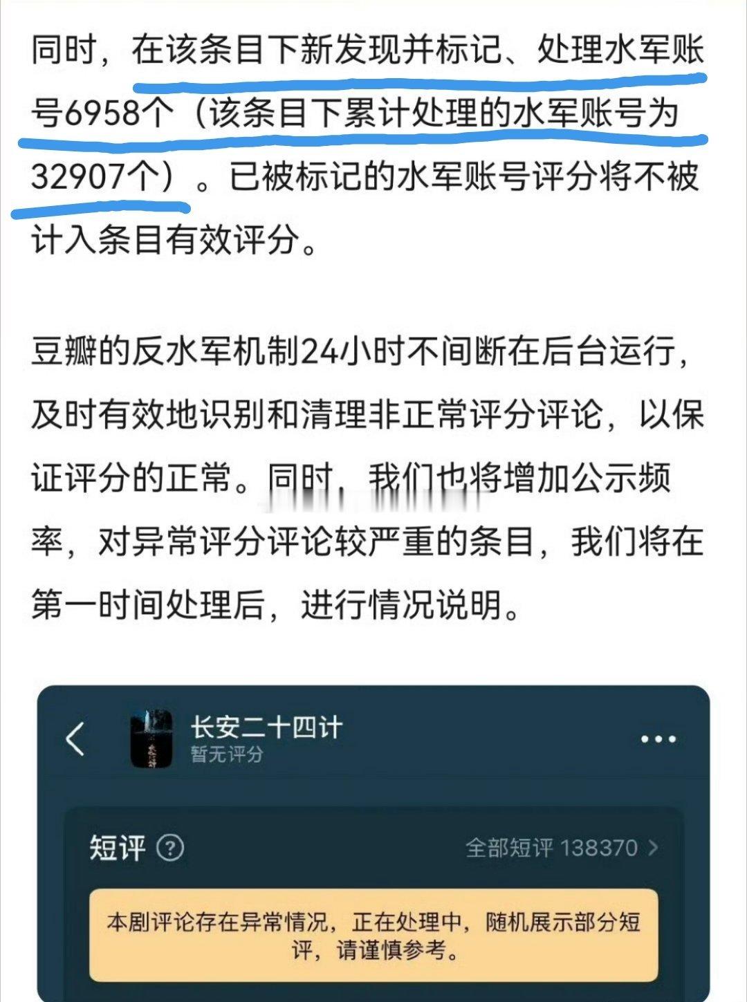 豆瓣发文回应,成毅《长安二十四计》评分异常情况简而言之:1.五星和一星的氵评都被清除了,并且不计入最终评分。2.在这部剧的评分中发现近3.3w个sj🐀,已经对这些全部近行评分无效处理。豆瓣回应长安二十四计异常情况长安二十四计