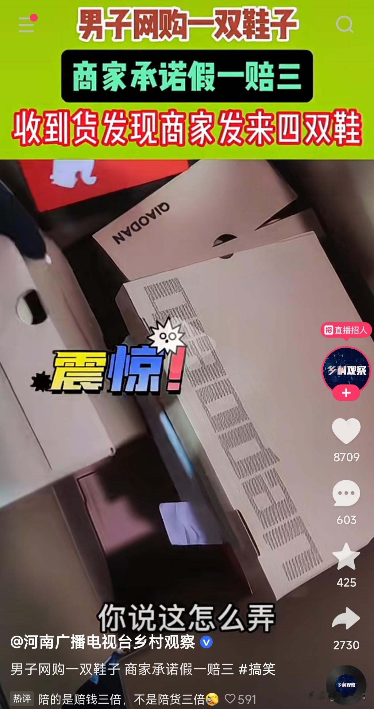 男子网购一双鞋子,商家承诺假一赔三,收到货后男子居然发现商家发来4双鞋,假一赔三到底赔的是三倍的钱?还是赔的三倍的货? 假一赔三这没有任何问题,能做到假一赔三的商家也确实是良心卖家,这不商家承诺假一赔三,明知道自己家的货是假的,发货的时候顺带假一赔三的承诺一起给买家发了四双,这算是不是信守承诺了? 有网友说假一赔三赔的是三陪的钱,而不是赔的三倍的货,这男子明显是被商家给套路了,话说回来这假一赔三到底应该赔三陪的货还是应该赔三倍的钱?