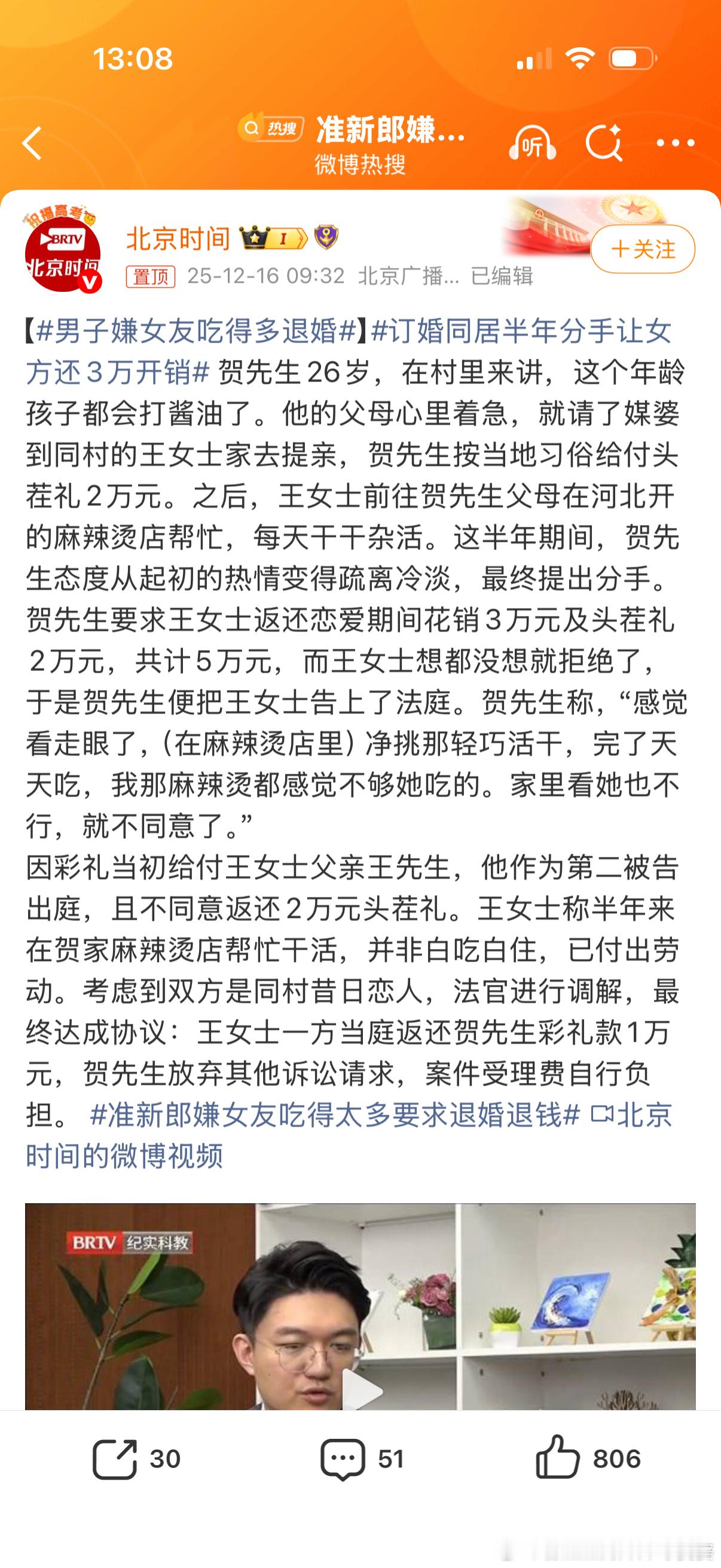 男子嫌女友吃得多退婚半年帮忙,工钱就算是一个月给2000,6个月也有12000吧?谈恋爱奔着结婚去的,谈了半年,零零碎碎,给个二三千块的礼物,也差不多。除非该女子有严重生理缺陷,否则可见这个男的及全家人品打❓