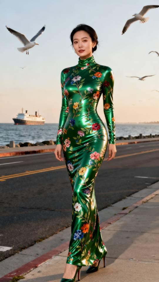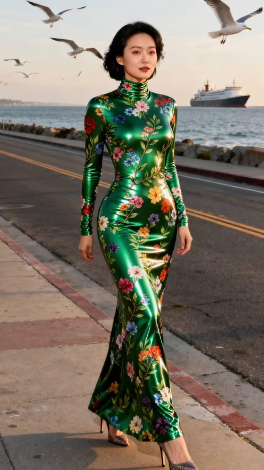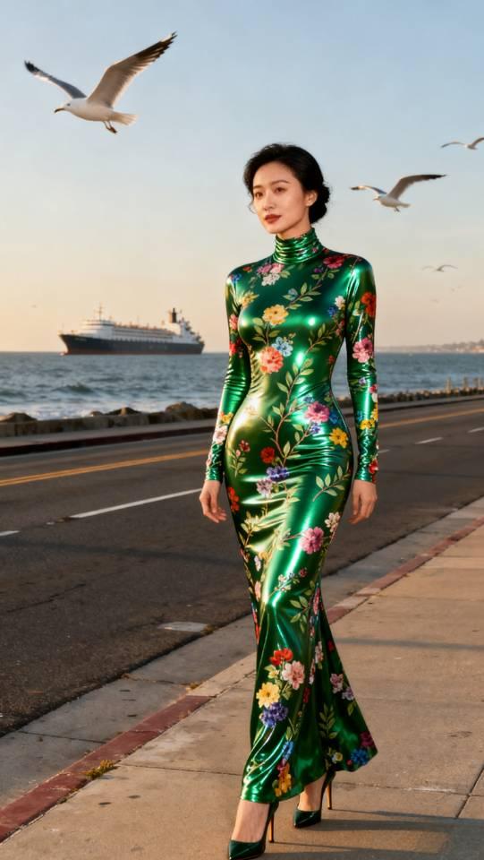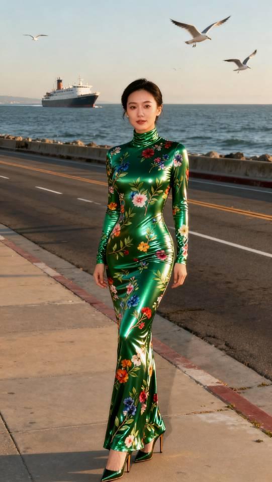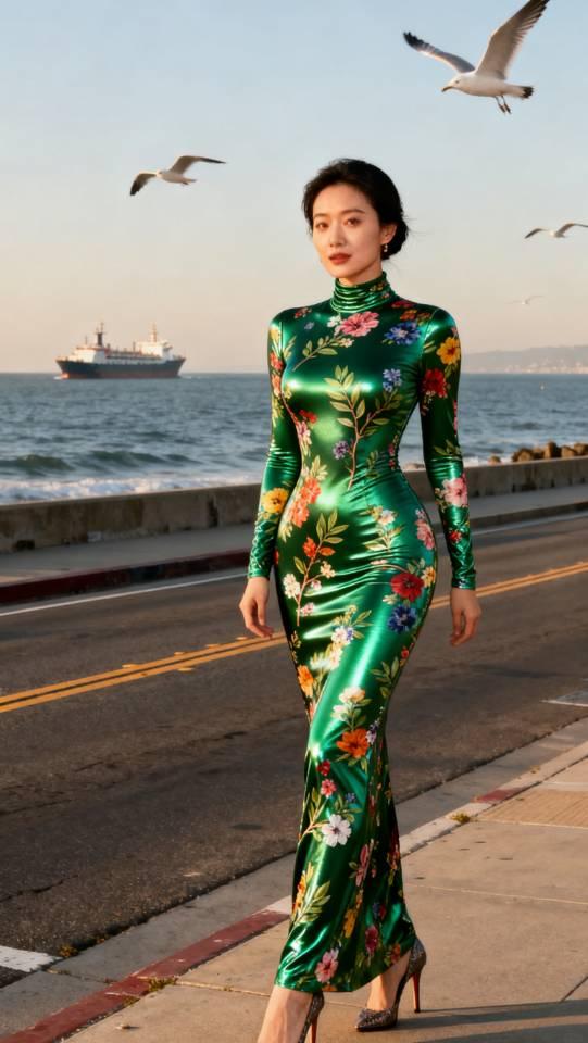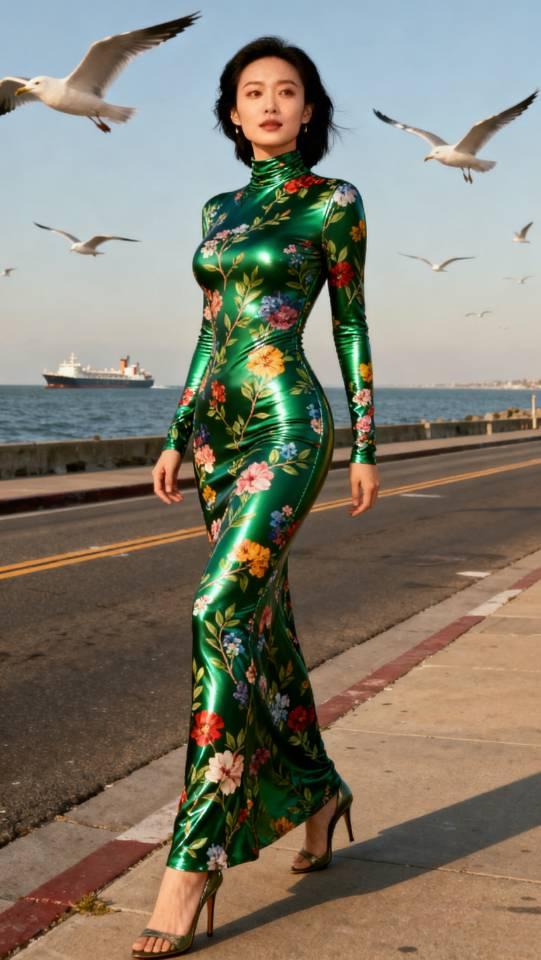 绿花连衣长裙女子漫步海边。连衣长裙绿长裙绿裙女神美女壁纸