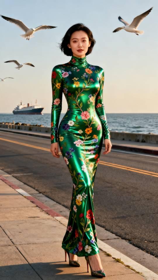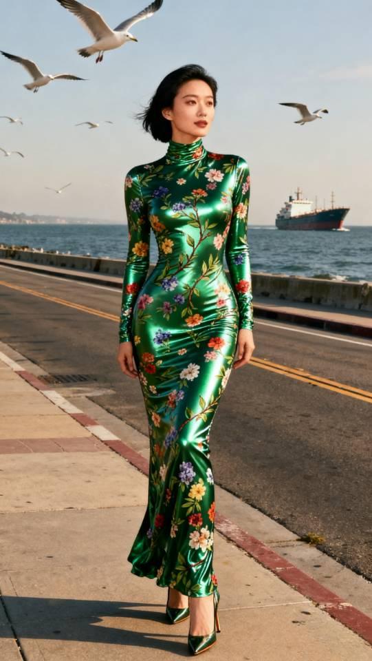 绿花连衣长裙女子漫步海边。连衣长裙 绿长裙 绿裙女神 美女壁纸