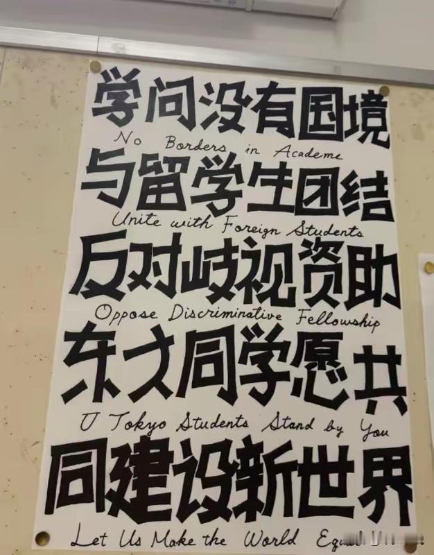 东大留学生正在帮助日本左翼青年觉醒 日本右翼基本是军国主义的代名词,而日本左翼基本就是进步青年的代名词。而东大的留学生正在通过各种形式帮助日本左翼青年的觉醒。 东大留学生在日本东京大学粘贴“大海报”写着“学问没有国境”等