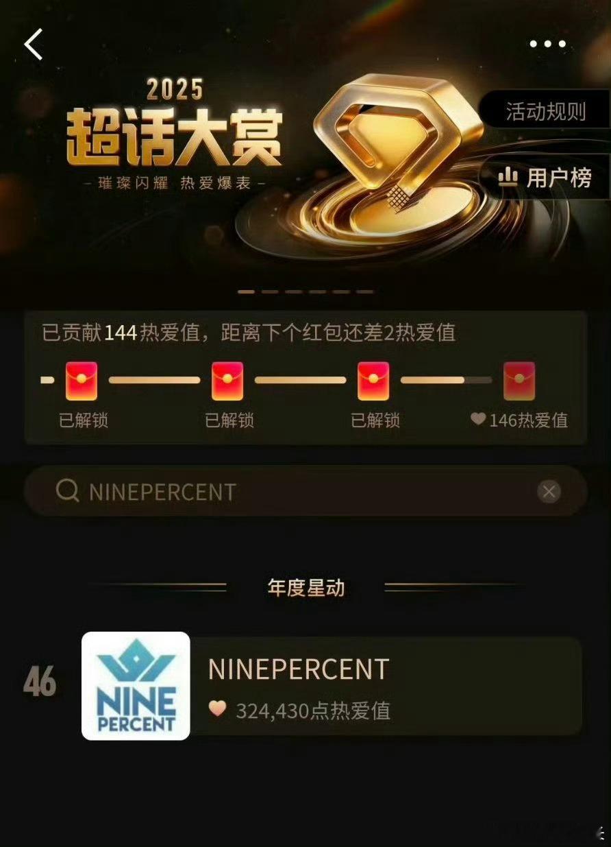 NINEPERCENT梦回2018NINEPERCENT的超话大赏排名最终定格在了46位!从722名到46名,排名定格在2018年的出道日大家的爱永远拿得出手NINEPERCENT超话大赏