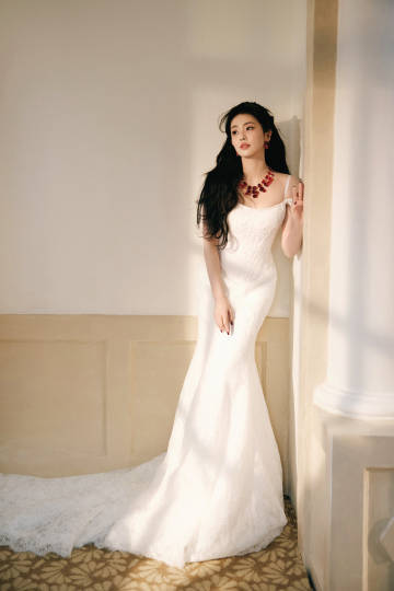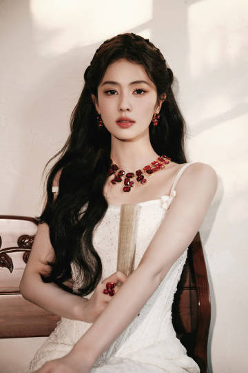 白鹿吊带拖尾白裙白鹿红宝石项链 白鹿吊带拖尾白裙