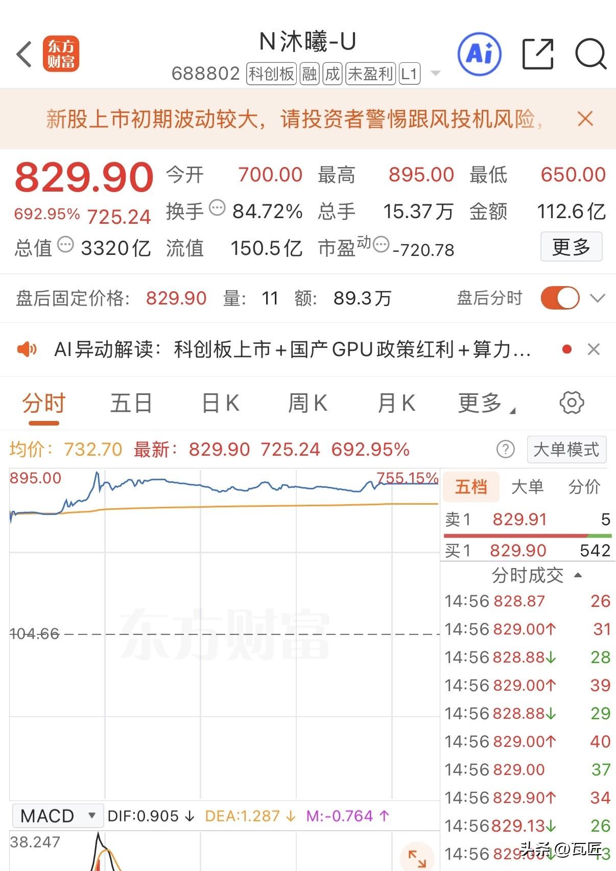 现在这科创板,简直成了机构提款机。摩尔线程刚表演完,沐曦又来,下次是不是该轮到壁仞了? 一股没有,好像错过了一个亿,心疼。 104.66的发行价,开盘直接700,最高冲到895!看着口干舌燥, 简直是给机构送钱。网上发行10%的份额,517万户抢0.03%的中签率,我这种小散连汤都喝不到。眼睁睁看着一签40万, 科创板人工智能 沐曦股份