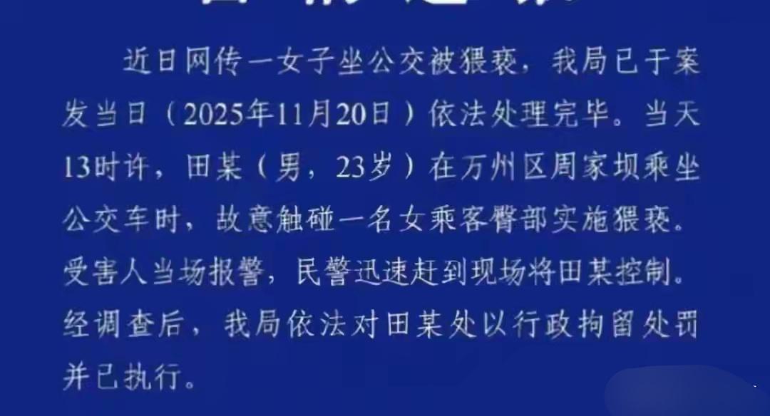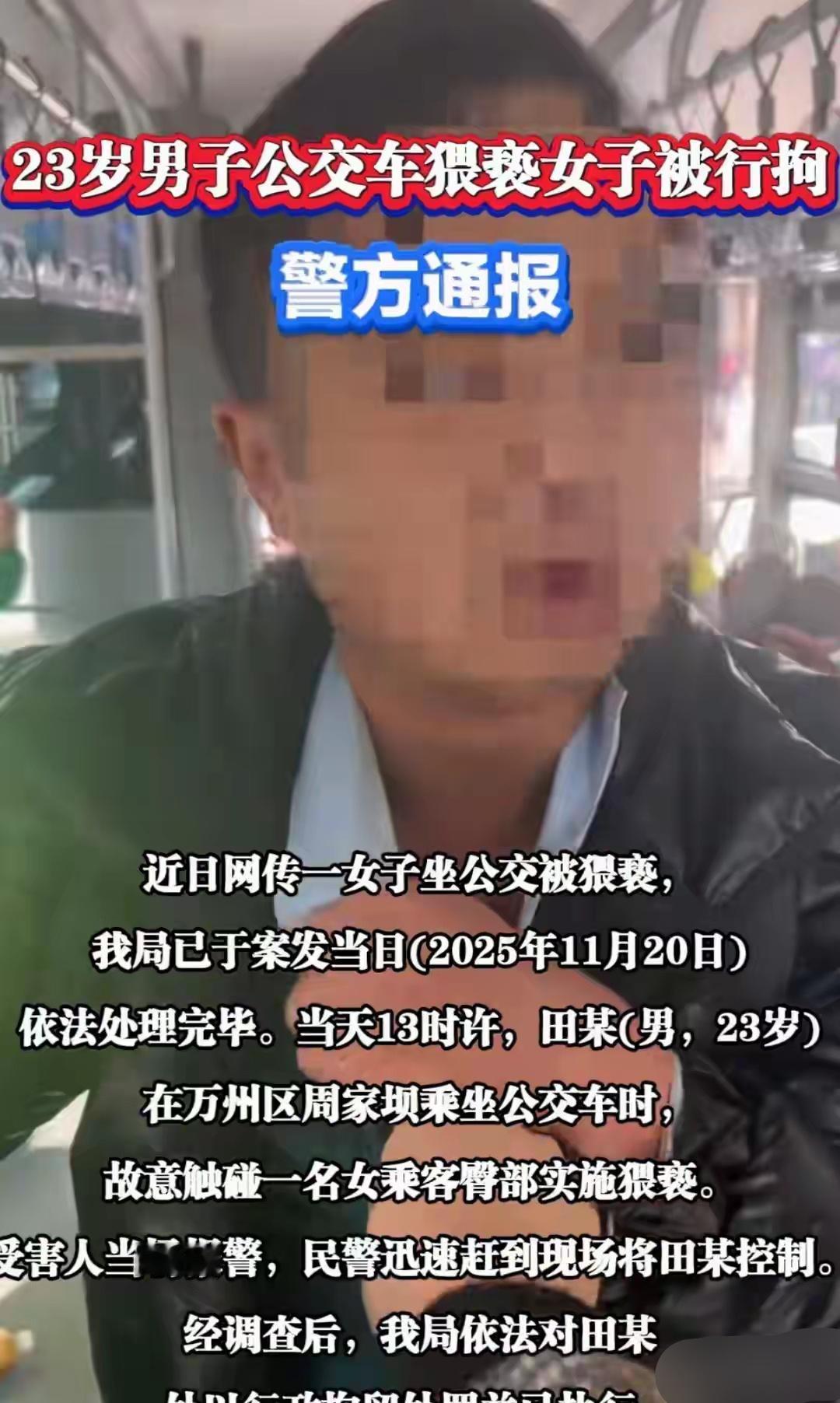 重庆公交猥亵案:女孩的果敢与十余名路人的缄默,真相背后的人性审视 2025年11月20日,在重庆万州一辆行驶的公交车内,一场关乎尊严与勇气的较量悄然拉开帷幕。23岁的女孩在拥挤的车厢中,遭遇了陌生男子田某的恶意猥亵,而这一幕,被车内十余名乘客默默目睹,却无人站出来制止。 事发时,田某趁着车厢拥挤,偷偷将手伸向女孩的臀部。起初女孩有所察觉,但碍于在公共场合的尴尬,并未立即声张。然而她的隐忍却让田某愈发胆大妄为,紧接着发起了第二次触碰。这一次,女孩不再隐忍,她强压内心的恐惧,迅速掏出手机,将田某的猥亵动作及后续对质过程完整记录下来,为自己留存了关键证据。 视频里,女孩与田某陷入了僵持对峙。面对女孩的指控,田某激烈反抗,坚决否认所有行为,甚至企图抢夺女孩的手机。而车厢内的十余名乘客,有的低头摆弄手机,有的转头望向窗外,有的面露犹豫,没有一人主动上前帮助女孩,也无人发声谴责田某的行径,整个车厢陷入了令人窒息的沉默。直到公交车到站,警方及时赶到,这场持续许久的对峙才宣告结束。 近日,警方正式通报了该事件的处理结果:经核实,田某的猥亵行为属实,目前已依法对其执行拘留处罚。女孩的冷静与果敢最终换来了正义的伸张,若不是她及时用手机固定证据,面对田某的矢口否认,这场维权之路或许会更加艰难。 而车厢内乘客集体沉默的原因,也引发了社会的广泛讨论。一方面,田某的猥亵动作较为隐蔽,在拥挤的公交车上,部分乘客确实难以第一时间判断事件真伪,担心贸然介入会造成误会,引火烧身;另一方面,“事不关己,高高挂起”的心态,也让不少人选择了明哲保身。在这个人人都顾虑“多一事不如少一事”的时代,害怕被牵连、担心误会他人的顾虑,成了阻碍人们挺身而出的无形障碍。 这场事件就像一面镜子,映照出了现实中的无奈与纠结。女孩的勇敢值得我们钦佩,她用智慧和勇气保护了自己,也让不法分子受到了应有的惩罚。但同时,车厢内的沉默也提醒我们:当他人遭遇不法侵害时,过度的迟疑与退缩,或许会让受害者陷入更加孤立无援的境地。 其实,挺身而出并非要求每个人都要直面危险。一句提醒、一次报警、一个支持的眼神,都可能成为受害者的力量源泉。我们既需要像女孩一样,在遭遇侵害时保持冷静,学会用合法途径保护自己;也需要在面对他人困境时,多一份勇气与担当,少一份冷漠与迟疑。 正义的实现,既需要受害者的勇敢抗争,也需要社会的温暖支持。愿这场事件能唤醒更多人的责任意识,让“事不关己高高挂起”的心态逐渐消散,让每个身处困境的人,都能感受到来自陌生人的善意与力量,让正义不再孤单。