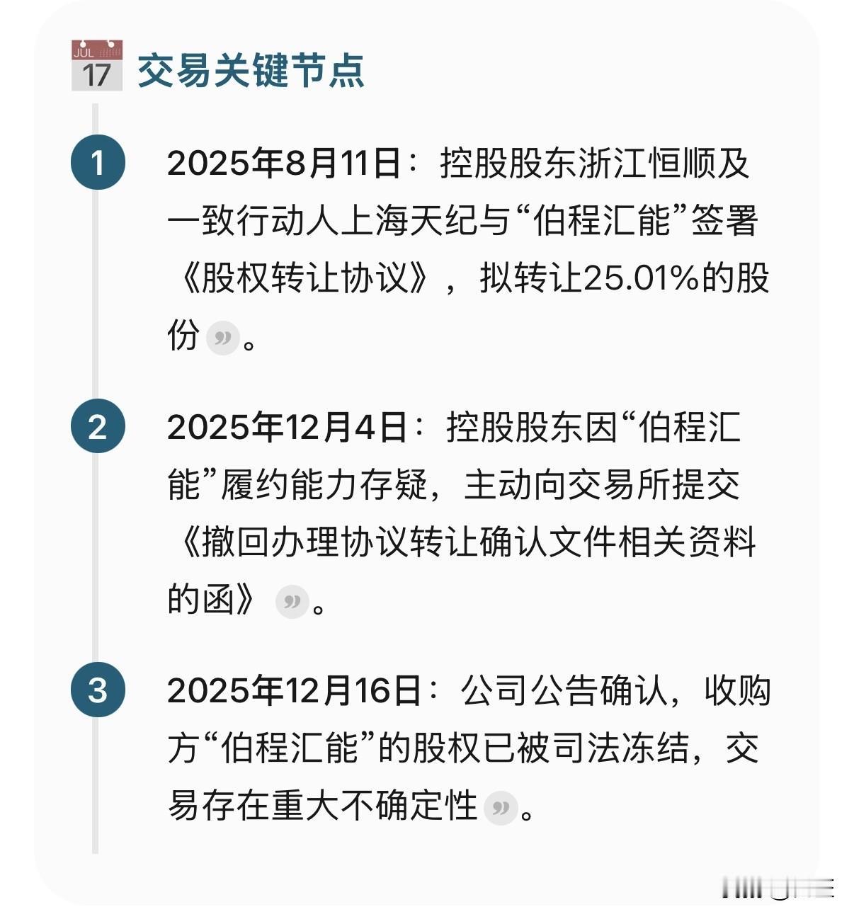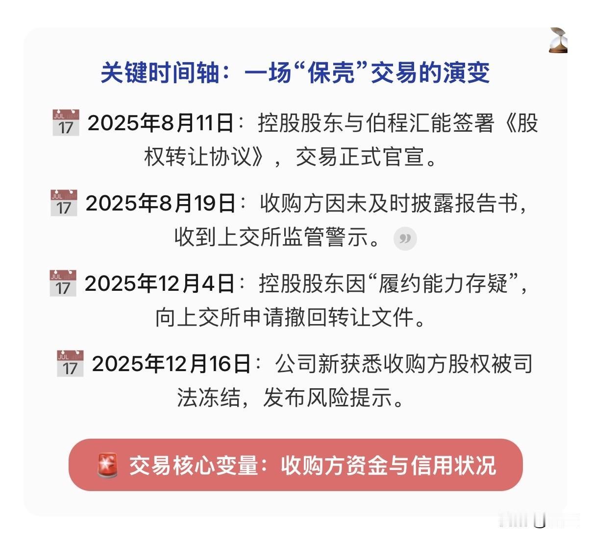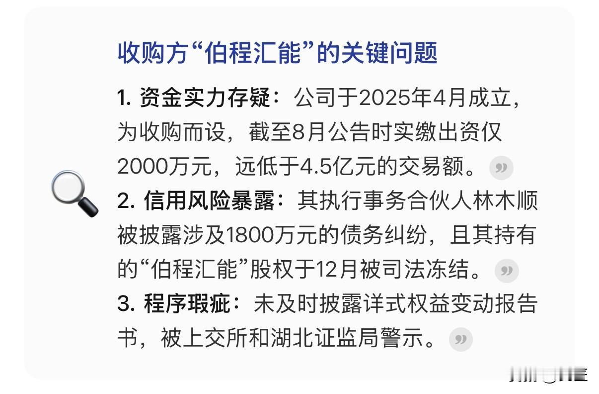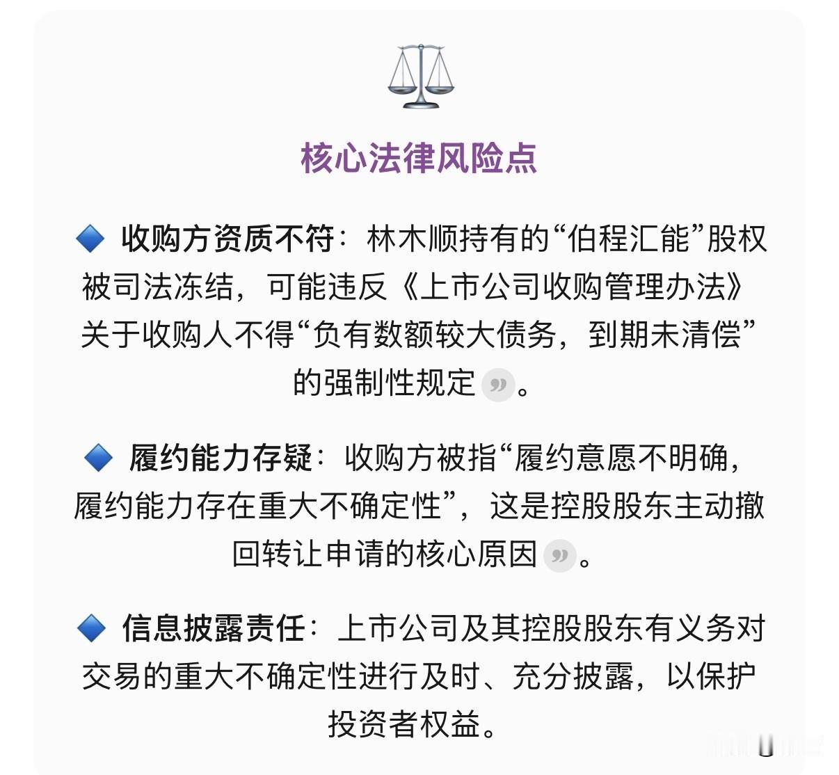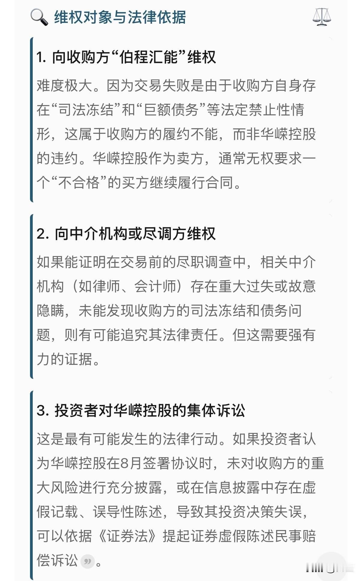 这个能维权吗? 上市公司要不承认自己管理是傻zi ,要不承认违法! 你觉得他选啥? 2025年8月11日签署的协议,计划将所持部分股份转让给伯程汇能和林木顺。 最新披露: 1,12月才发现收购方股权被冻结?上市公司撒谎吗?公司于8月11日公告的是“协议签署”,而“股权被司法冻结”是12月16日通过公开渠道新获悉的事实,属于重大事项进展,公司随即在12月5日及16日发布了风险提示公告,履行了持续披露义务。 2,华嵘控股在2025年8月签署的控制权转让协议中,收购方海南伯程汇能科技中心(有限合伙)截至公告时实缴资本仅2000万元,却需支付4.5亿元对价,资金实力存在巨大缺口,此风险在签约时理应被充分评估和披露。 上市公司和人签卖身协议都不被调吗? 3,“华嵘控股在8月签署协议时,可能并未完全掌握收购方‘伯程汇能’存在司法冻结及巨额债务的致命风险,这导致交易在12月被叫停,这个情况,可以法律维权吗?”这一核心问题,答案是:存在法律维权的可能性,但路径复杂,且需证明华嵘控股或其控股股东在交易中存在重大过失或未履行法定信息披露义务。 交易的失败主要源于收购方自身资信问题,而非华嵘控股的主动违约,因此直接向收购方索赔或要求其履约的难度极大。 华嵘控股 ST华嵘
