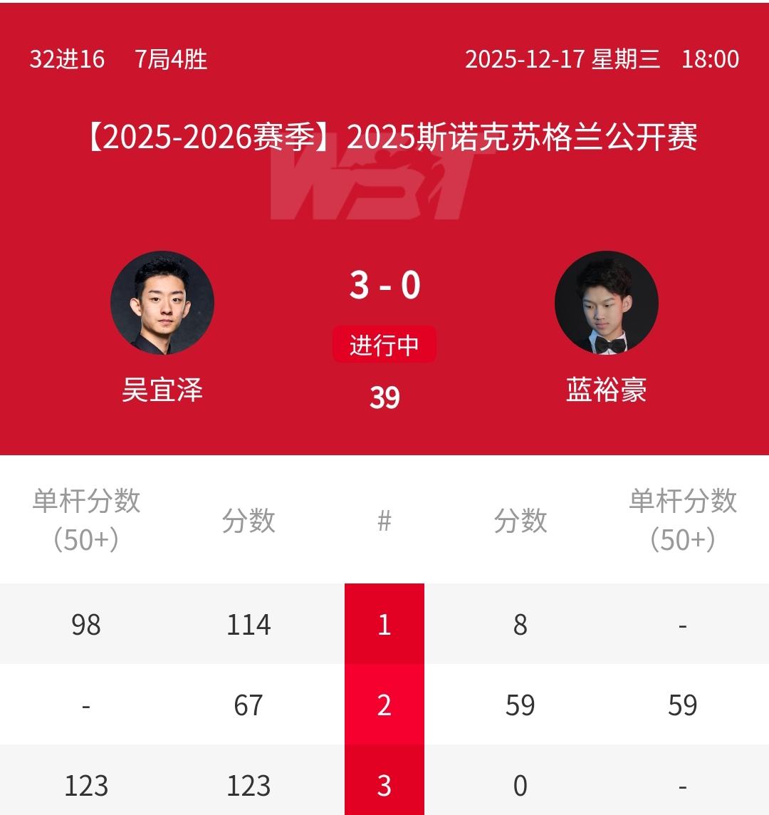 3-0赢赛点,轰123-0,中国德比战:国锦赛冠军吴宜泽状态开挂!北京时间12月17日晚,正在进行2025年斯诺克苏格兰公开赛第二轮,国锦赛冠军吴宜泽与职业赛新人蓝裕豪上演中国德比战。这场比赛,吴宜泽尽显斯诺克才华,他在比赛中打得游刃有余,第一局,吴宜泽就打出单杆98分,第三局又轰出单杆123分,前三局结束后,取得3-0的领先优势,并赢得三个赛点,再胜一局就将晋级,对手蓝裕豪想要晋级就必须连扳④局,那么,会吗?丁俊晖 赵心童