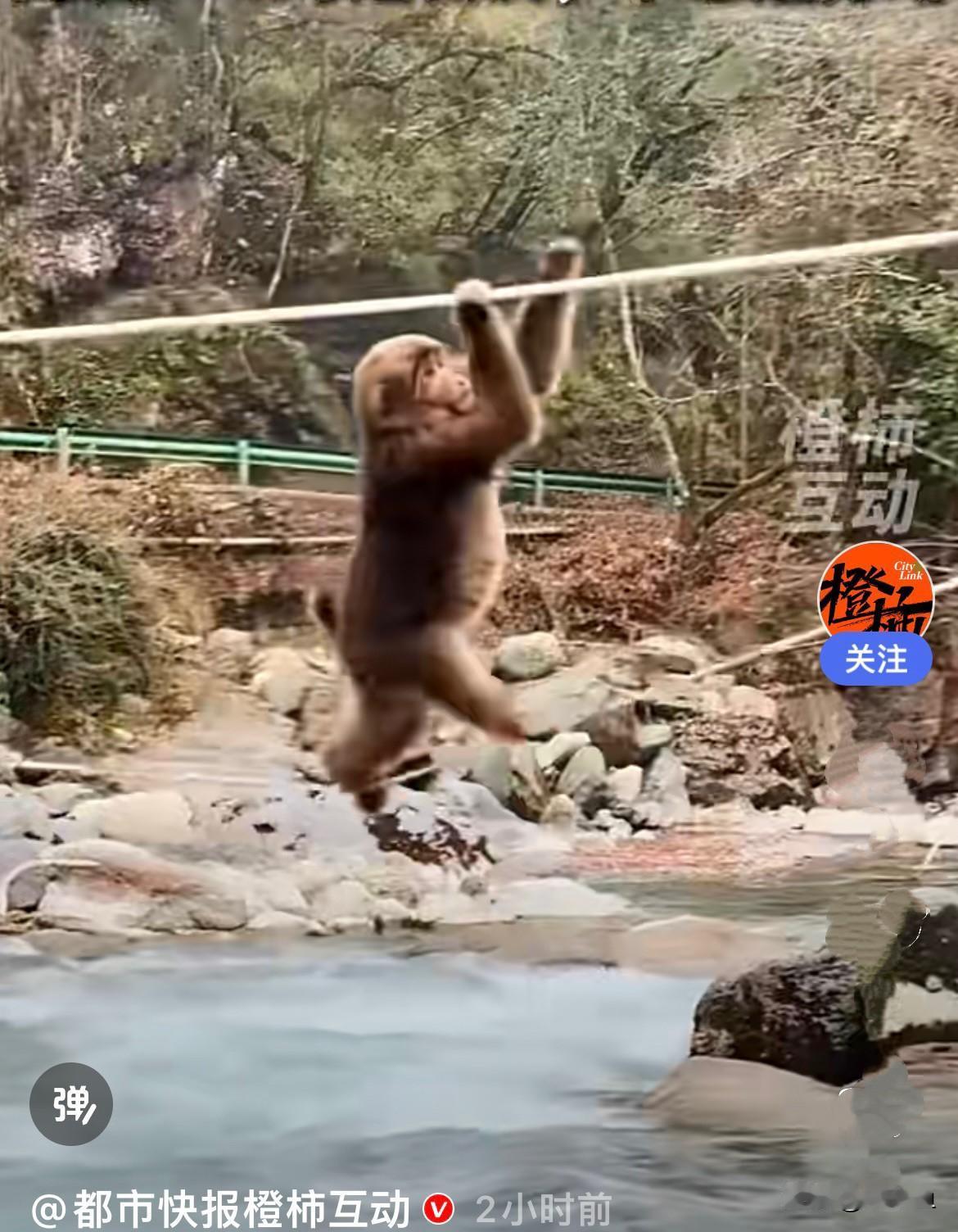 近日,四川雅安一网友和朋友网友姜在喇叭河的河道边上游玩,河对面的猴子一看,河对面的人好多啊,心想肯定能“抢”到吃的,不惜“跋山涉水”,急的手脚并用爬绳索过河…… 老孙来也,看见背包的上去就抢,拽着游客的包不放,路上拆开的零食扣袋、饮料瓶什么的都是猴子抢的…… 游客还以为猴子在表演,哪知道是劫匪来了,既淘气又好笑……